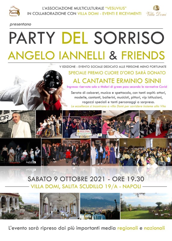 Ritorna il Party del Sorriso si svolgerà sabato 9 ottobre 2021 alle ore 19:30 nello scenografico luogo di Villa Domi ai Colli Aminei, per una bellissima serata dedicata alla solidarietà delle persone meno fortunate donando sempre tanti “Smiles”. Questa importante kermesse solidale ideata e curata dall’artista poliedrico Angelo Iannelli, conosciuto come Ambasciatore del Sorriso, in collaborazione con l’Associazione Vesuvius e Villa Domi Eventi del patron Domenico Contessa, è tra le più emozionanti a livello nazionale per essere un vero e proprio “termometro emotivo”. Come sempre richiama tante personalità eccellenti come artisti, modelle, cantanti, imprenditori e ragazzi speciali per un vero mix di intense emozioni tra arte, sociale, moda, musica e spettacolo. L’anno scorso il prestigioso riconoscimento Premio Cuore D’oro è andato all’ex Presidente Società Calcio Napoli Corrado Ferlaino e quest’anno andrà al cantautore Erminio Sinni, il vincitore della prima edizione di The Voice Senior nel 2020, che è ritornato alla ribalta con il nuovo singolo “La Terrazza” uscito il 23 luglio scorso. Lo Smile’s Injector Angelo Iannelli è pronto a stupirci anche in questa V Edizione per un’altra serata en plein di Sorrisi e mettendo in pole position il sociale.