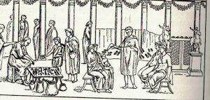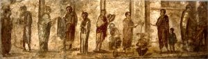 In un’altra scena un mercante mostra i tessuti poggiati sul suo braccio sinistro a due signore che toccano la stoffa e pare che non si fidino troppo delle parole del venditore. Chiudono la scena una serva che sta in attesa e un uomo in tunica corta, forse il servo del mercante, che cerca di trattenere alcune donne che si stanno allontanando. E’ probabile che il mercante venga da fuori città. A Pompei c’erano importanti officine tessili, come quella di Eudosso, in cui lavoravano molti operai: nel portico dell’officina si sono trovati i nomi graffiti di sette uomini e undici donne, e tra queste, un’ Amarillide a cui è dedicata una volgare epigrafe. C’erano tra gli operai anche due giudei: la donna si chiamava Maria, e l’uomo Tamudiano Vesbio: Tamudiano da Thamud, la città da cui egli veniva, Vesbio, dal nome del monte più importante del territorio.