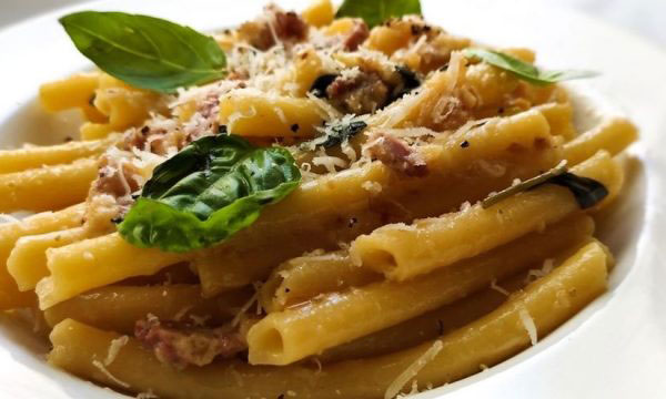 Ingredienti: 400 gr di mezzanelli, maccaroncelli o ziti; 140 gr. di lardo di pancia di maiale o di colonnata,1 cipolla o 1 spicchio d’aglio, peperoncino o pepe,sugna oppure olio extra vergine d’oliva, mezzo bicchiere di vino bianco secco,parmigiano e pecorino romano grattugiati, basilico fresco, sale q.b. Tagliare il lardo a pezzetti e poi batterlo a coltello facendolo diventare una cremina; far soffriggere leggermente e delicatamente la cipolla in pochissima sugna, oppure in olio extravergine, e poi aggiungere il lardo e farlo sciogliere bene e delicatamente a fiamma dolce: altrimenti si secca e si indurisce. Poi aggiungere il vino bianco per deglassare il fondo della padella, e far evaporare completamente. Aggiungere peperoncino o pepe. Scolare la pasta bene al dente e saltarla in padella, aggiungendo anche un po’ di acqua di cottura per far legare il tutto. Servire il piatto con una bella manciata di pecorino romano, o misto parmigiano, o grana e pecorino, e con basilico ( dal sito: La Cucina di Napoli).