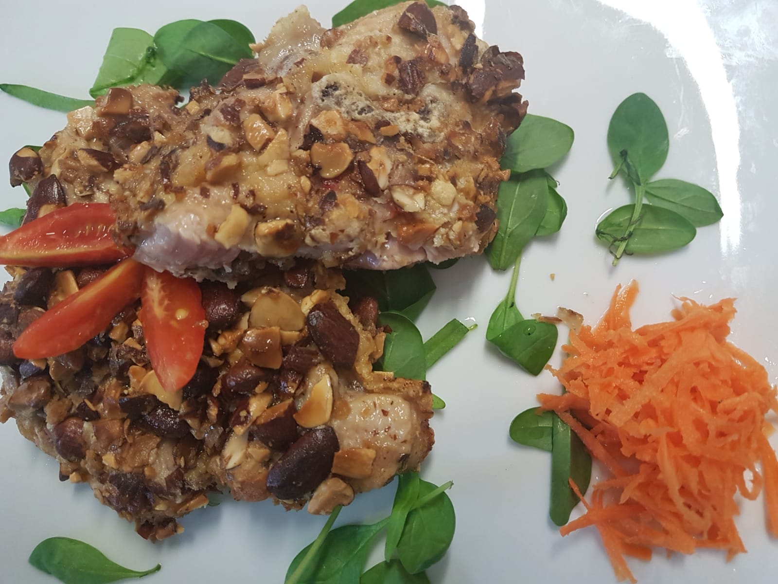 Ingredienti (4 persone): 4 sovracosce di pollo disossate, 2 uova, 200 gr. di mandorle tostate, 20gr. di burro, 20 gr. di farina, e salsa di soia, olio, aceto di riso, sale, rucola, erba vasciolella, tarassaco, borragine, pomodorini del piennolo e fili di carota: tutto, quanto basta. Sfilettare le sovracosce di pollo e tagliarle a metà, metterle a bagnomaria in una ciotola dove precedentemente hai sbattuto le uova con un pizzico di sale e un goccio di aceto e lasciarle marinare. Prendere una pentola antiaderente, portarla a temperatura alta e versarci le mandorle girandole continuamente. Dopo 2/3 minuti mettere le mandorle su un foglio di carta da forno e farle raffreddare. Poi chiudere la carta da forno a portafoglio e con il batticarne battere le mandorle. Immergere il pollo nelle uova sbattute precedentemente con sale e gocce di aceto, passarlo sulle mandorle tritate e poi farlo cuocere in una pentola antiaderente con un filo d’olio di oliva e noce di burro. Quando le mandorle risultano cotte, il pollo è pronto per andare in tavola, su un letto di erbette del Vesuvio e di fili di carote, e “incoronato” dai pomodorini del piennolo.
