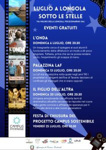 La rassegna si concluderà con la Festa di Chiusura del Progetto Campus Sostenibile, in programma venerdì 25 luglio alle ore 20:30.