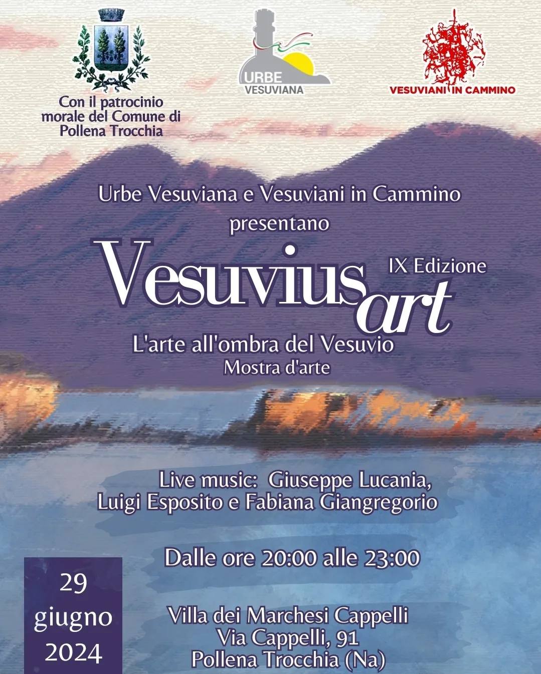 Pittori, disegnatori e grafici, fotografi e musicisti che si esibiranno dal vivo. Saranno questi gli ospiti dell’edizione numero nove di “Vesuvius Art – L’arte all’ombra del Vesuvio”, manifestazione ospitata sabato 29 giugno presso Villa Marchesi Cappelli a Pollena Trocchia. «Siamo orgogliosi di essere arrivati alla nona edizione di quest’evento itinerante sul territorio vesuviano, che si arricchisce ogni anno di nuovi artisti e talenti e richiama sempre tante persone. Sarà una bellissima serata all’insegna dell’arte, della cultura e della musica, in una villa storica immersa nel Parco Nazionale del Vesuvio» ha detto Vincenzo Di Costanzo, presidente dell’associazione Urbe Vesuviana, che da quasi un decennio organizza la rassegna artistica e che quest’anno si avvale della collaborazione dell’associazione Vesuviani in Cammino. La manifestazione, che gode del patrocinio morale del comune di Pollena Trocchia, prenderà il via alle ore 20 di sabato e si protrarrà fino alle 23 nella suggestiva villa storica di via Cappelli. Dopo Sant’Anastasia e Somma Vesuviana, dunque, il “Vesuvius Art” con i suoi talenti e le opere che mette in mostra invade anche Pollena Trocchia, proseguendo un percorso lungo e fortunato che vuole contaminare con l’arte e la bellezza il territorio all’ombra del Vesuvio, contribuendo alla valorizzazione dell’intera area e dei suoi tesori nonché alla promozione di tanti validi artisti.