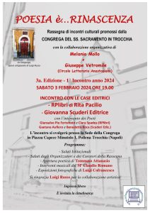 Saranno due importanti Case Editrici campane a inaugurare il 2024 della Rassegna culturale “Poesia è… Rinascenza”, il cui primo incontro del nuovo anno è in programma, come di consueto a Pollena Trocchia, sabato 3 febbraio alle ore 19:00. Sarà allora che la storica Congrega Arciconfraternita del SS. Sacramento in Trocchia, sede degli incontri grazie alla disponibilità e all’accoglienza dei Confratelli e in particolare del Priore dottor Andrea Sannino, accoglierà la RPlibri di Rita Pacilio, da San Giorgio del Sannio (BN), e la Scuderi Edizioni di Giovanna Scuderi, da Avellino. Le case editrici interverranno in merito alla loro attività e produzione editoriale attuale e al loro contributo professionale nella diffusione e nella promozione della cultura letteraria in ambito locale e nazionale. Con loro, la testimonianza degli autori Giansalvo Pio Fortunato e Clara Spadea per la RPlibri, e Gaetana Aufiero e Benedetta Roca per la Scuderi Edizioni. Il nuovo anno porterà con sé novità anche per la cornice musicale della Rassegna: sarà il noto e illustre Maestro Claudio Romano ad impreziosire la serata con una sua performance alla chitarra. Atteso inoltre il ritorno dell’artista fotografo Luigi Cofrancesco, da San Salvatore Telesino, con le sue esposizioni. Dopo i saluti iniziali, sarà il giovane Tommaso Attanasio ad aprire la serata con la lettura di una sua breve poesia, mentre l’artista e poeta Pasquale Rea di Pollena Trocchia allieterà il pubblico con un suo intervento in chiusura. Non mancherà la partecipazione del blog Informiamo Pollena Trocchia e dell’artista Luigi Russo, maestro artigiano dell’arte sacra e presepiale, graditissimo collaboratore della rassegna. Nata il 1° Aprile 2022, la Rassegna “Poesia è… Rinascenza” quest’anno compie il suo secondo anno di vita e promette di continuare a programmare ancora a lungo i suoi incontri, grazie alla competenza e all’entusiasmo dei suoi ideatori Melania Mollo e Giuseppe Vetromile, che danno seguito al progetto culturale operando in modo del tutto autonomo, pur potendo contare sugli apprezzamenti e sugli incoraggiamenti da parte delle istituzioni del territorio e degli amici.