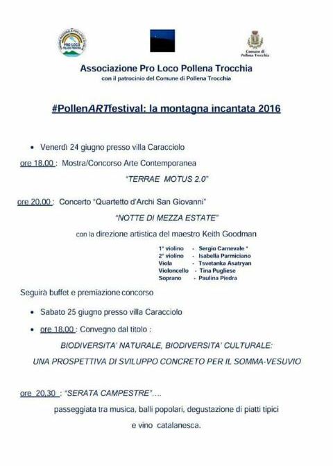 L’identità, le radici, il passato e la modernità. Tra le molteplici iniziative che arricchiranno questo inizio di stagione estiva, un progetto importante riguarda la valorizzazione del territorio vesuviano, la sua identità, l’appartenenza. L’associazione Pro Loco di Pollena Trocchia, con il patrocinio del comune, presenta il progetto “PollenArtFestival: La montagna incantata 2016”, una bellissima iniziativa volta a promuovere lo sviluppo storico-culturale della cittadina di Pollena e dei comuni vesuviani. Tutta quella realtà che ruota intorno al monte Somma –Vesuvio, ricca di storia, che con grande determinazione desidera fa conoscere le sue bellezze e le potenzialità territoriali.