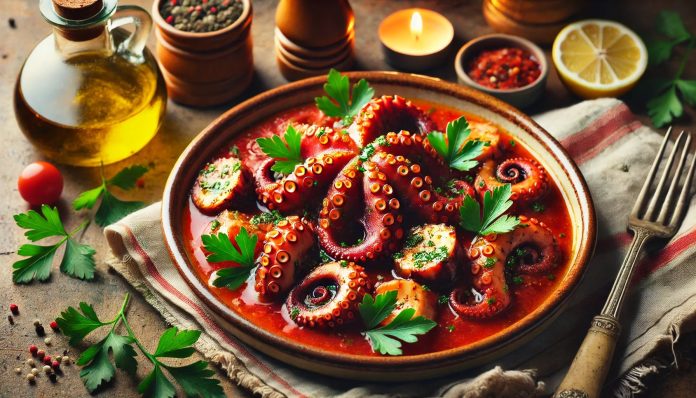 Ingredienti (per 4 persone): kg. 1, 200 di piccoli polpi veraci; gr. 500 di pomodori pelati; 2 spicchi d’aglio, prezzemolo, olio, pepe e sale. Seguiamo la ricetta pubblicata da Maria Giovanna Fasulo Rak nella plaquette “La cucina napoletana”: “I polpi veraci si riconoscono dalla doppia fila di ventose sui tentacoli. Sono più saporiti e profumati di quelli di fondo. Questa ricetta, profumata dall’aglio e dal pomodoro e dalla cottura nel coccio, è adatta a dare sapore anche ai polpi meno pregiati. Ripulite i polpetti della sacca interna e del becco, lavateli e metteteli in una pentola di coccio con l’olio, il pomodoro, l’aglio, un pizzico di sale e il pepe. Coprite bene e fate cuocere a fuoco lento fino a quando i polpetti non siano teneri e il sugo addensato (circa ¾ d’ora). Aggiungete il prezzemolo tritato 10 minuti prima del termine della cottura. Scoprite la pentola raramente e velocemente perché il profumo non si disperda.”.