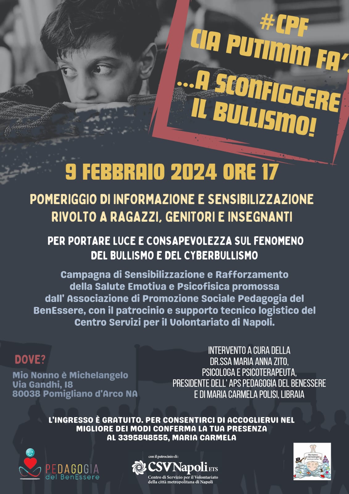 Una campagna di sensibilizzazione e rafforzamento della salute emotiva e psicofisica rivolta a ragazzi, genitori e insegnanti ma aperta a tutti. È questo il senso dell’iniziativa “#CPF-Cia Putimm Fa’!”, promossa dall’associazione “Pedagogia del BenEssere” di Pomigliano D’Arco, che si occupa di benessere psicologico della persona e della collettività. Si tratta di un calendario di cinque giornate, in luoghi diversi di aggregazione, per conoscere e riflettere insieme su argomenti che rappresentano le sfide e le opportunità che la nostra società affronta in questo momento storico. La prima tappa si terrà il 9 febbraio alle 17 presso la libreria Mio Nonno è Michelangelo e ha il titolo di “Cia Puttimm Fa’… A sconfiggere il Bullismo!”.