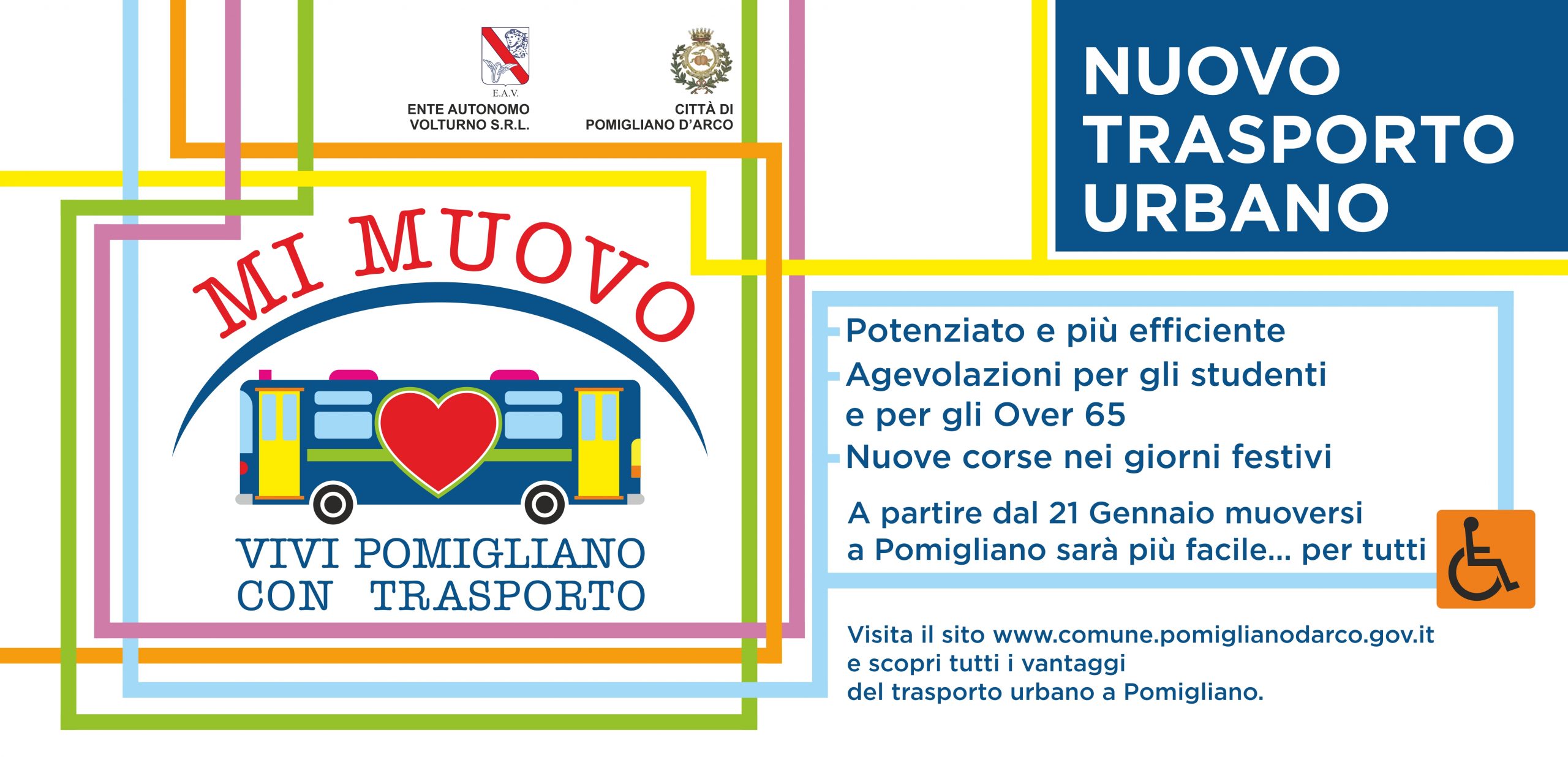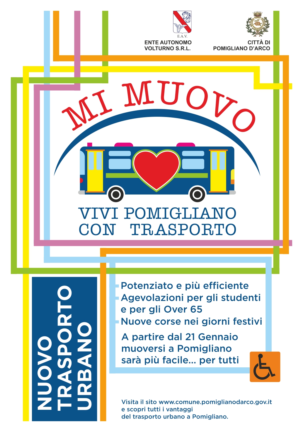Le modifiche richieste all’Eav (Ente Autonomo Volturno srl) dal Comune di Pomigliano d’Arco partiranno da sabato 21 gennaio, dunque itinerari modificati per andare incontro alle esigenze degli utenti dei mezzi pubblici, maggiori servizi di domenica e negli altri giorni festivi, tutti gli autobus in possesso di dotazioni tali da non creare disagi agli utenti diversamente abili. Pronta anche la campagna di comunicazione voluta dall’amministrazione di Pomigliano d’Arco e in particolare dall’assessore Leonilde Colombrino (deleghe all’Ambiente e Città Intelligente), lo slogan è «Vivi Pomigliano con Trasporto». Da sabato dunque, spostarsi nel territorio di Pomigliano d’Arco senza far ricorso all’auto sarà molto più facile e si potrà contare su un servizio potenziato ed efficiente. Tutti i dettagli e le fermate delle quattro circolari saranno disponibili e consultabili, a partire da domani (giovedì 19 gennaio) sul sito web ufficiale dell’ente http://www.comune.pomiglianodarco.gov.it/, come sulla pagina Facebook (Comune di Pomigliano d’Arco), dove si potranno anche scoprire tutti i vantaggi del trasporto urbano cittadino.