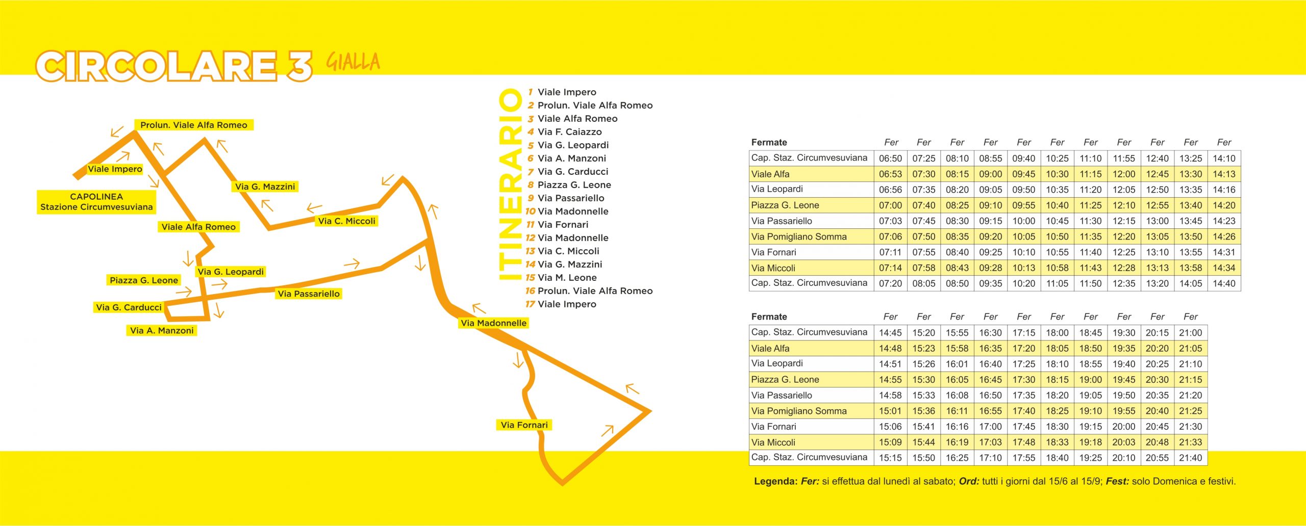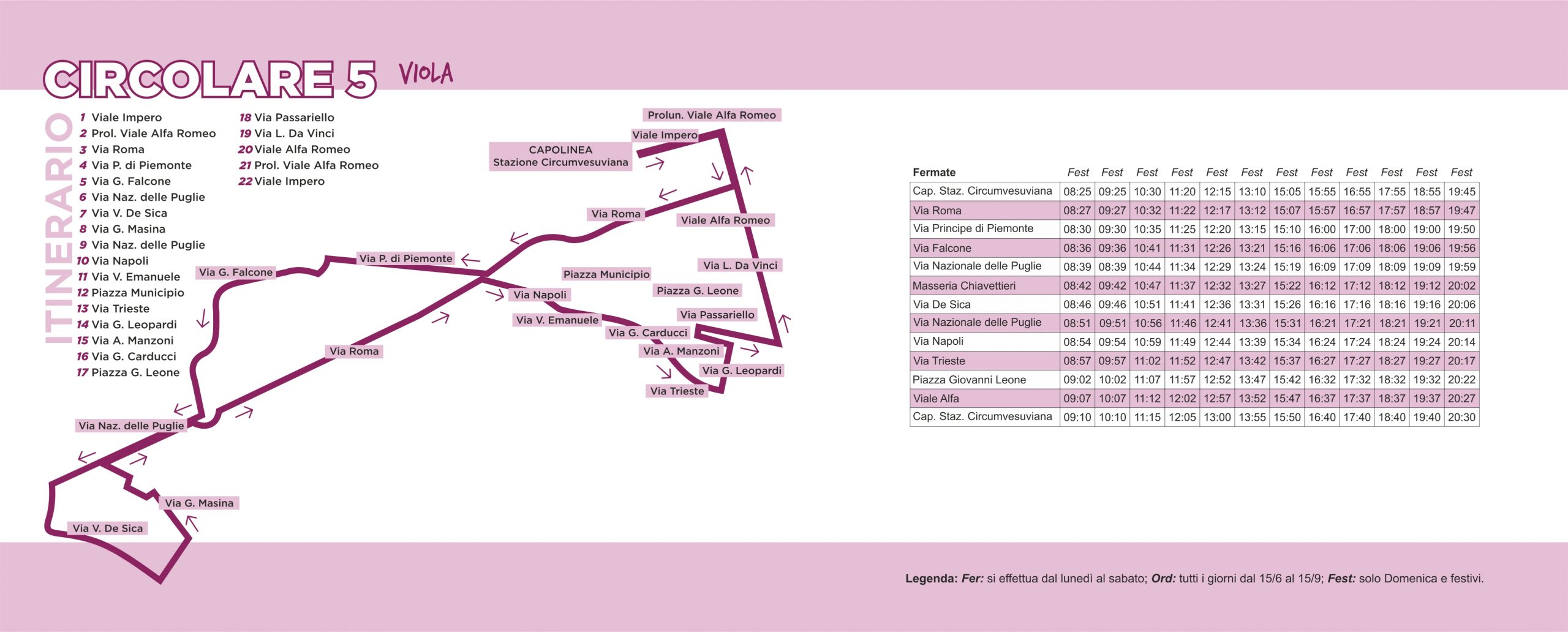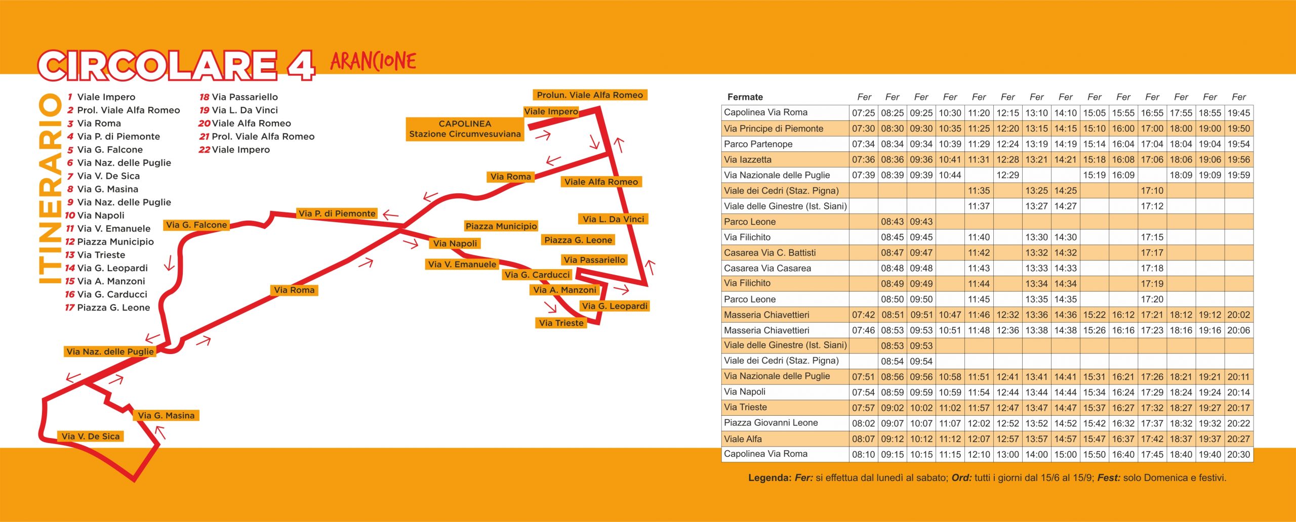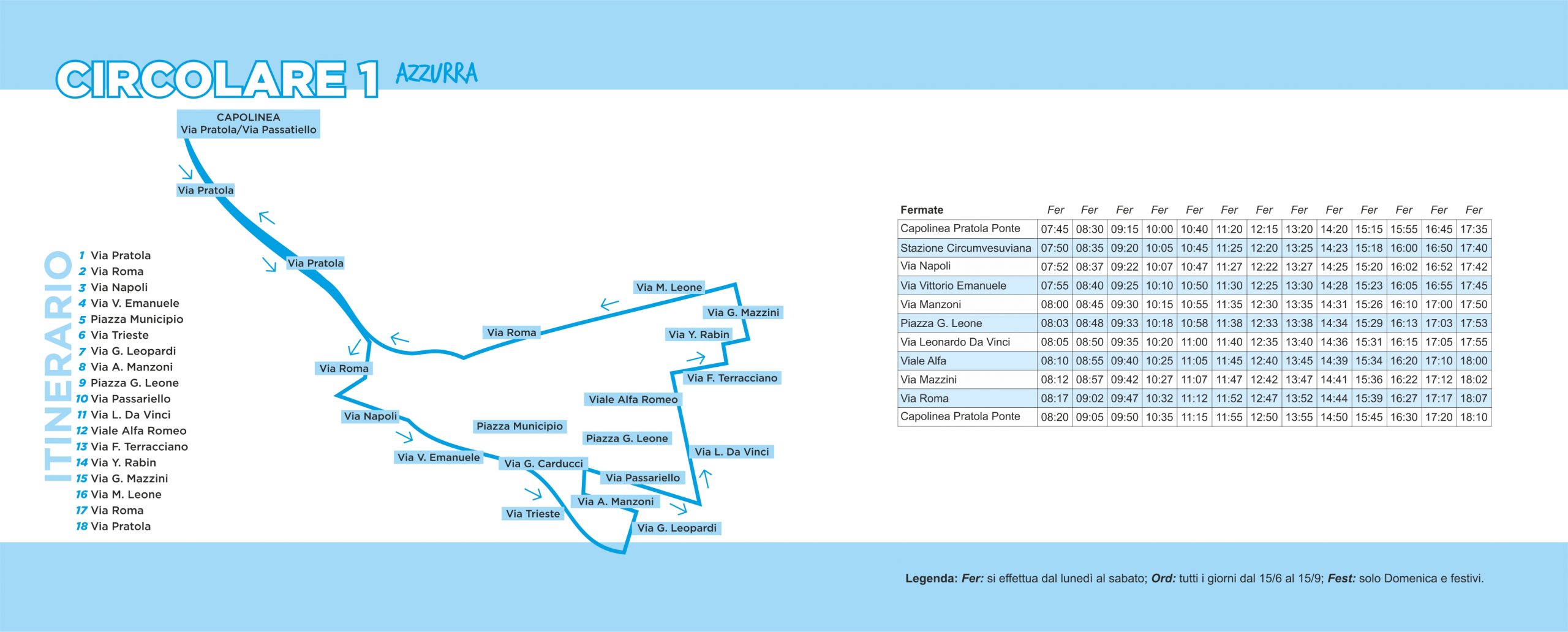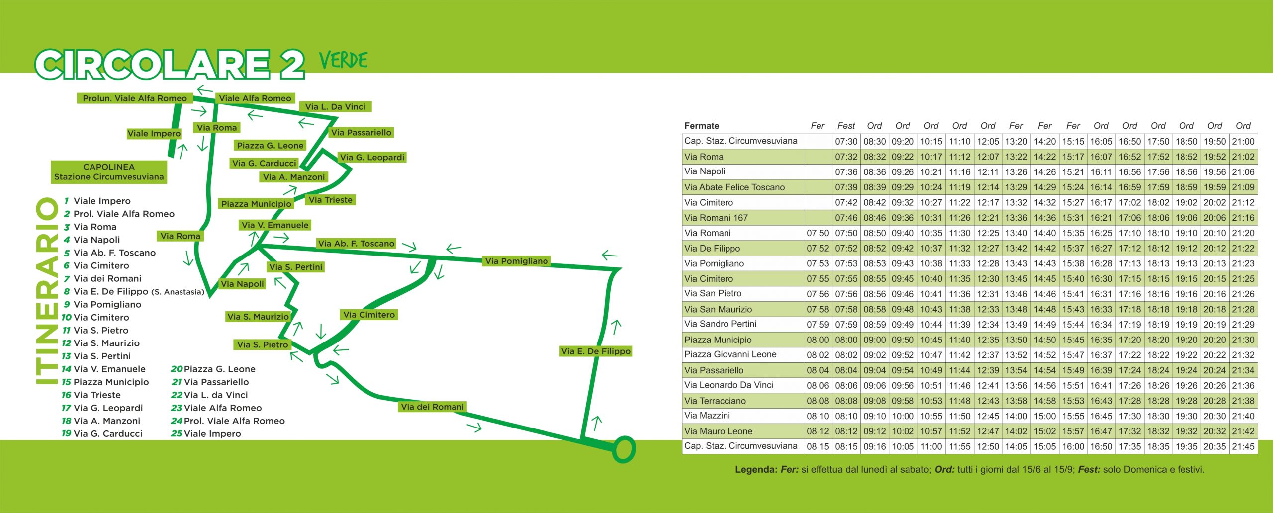 Le quattro distinte circolari, più una dedicata solo alle corse festive, percorrono itinerari che abbracceranno l’intero territorio di Pomigliano d’Arco, dal centro storico alle periferie. L’itinerario della circolare 1 (Azzurra) con capolinea in via Pratola, comprende tutti gli snodi del centro città, da via Roma a via Napoli, da via Vittorio Emanuele a piazza Giovanni Leone, da viale Alfa a via Mazzini. La circolare 2 (Verde) – capolinea Stazione Circumvesuviana – si snoda tra centro e periferia, toccando via Romani, via Cimitero, via San Pietro, via Passariello. La circolare 3 (Gialla) – capolinea Stazione Circum – percorre viale Alfa, via Leopardi, via Pomigliano, via Fornari, via Miccoli. La circolare 4 (Arancione) dal capolinea di via Roma tocca aree periferiche e masserie, da via Principe di Piemonte al Parco Partenope, da via Nazionale a Masseria Chiavettieri. La circolare 5 (Viola) è in servizio solo di domenica e negli altri giorni festivi, con capolinea la Stazione Circumvesuviana, e consente di spostarsi agevolmente dalla periferia al centro e viceversa.