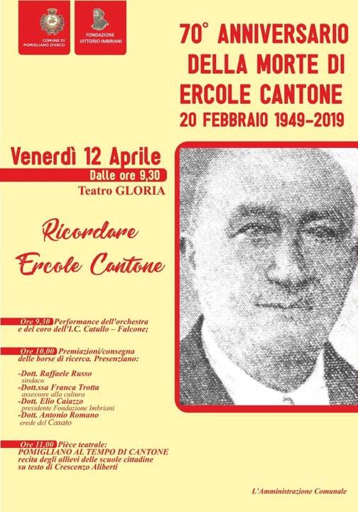 Pomigliano d’Arco celebra il 70esimo anniversario dalla morte di Ercole Cantone, scomparso nel 1949: l’appuntamento è per le 9, 30 di oggi– venerdì 12 aprile – al Teatro Gloria.