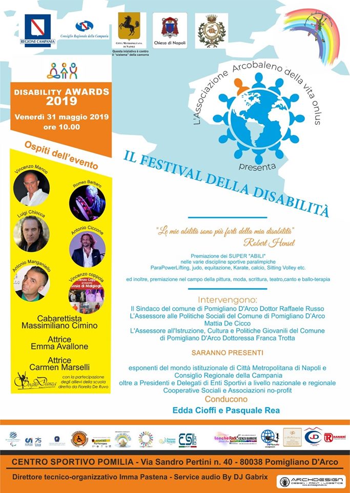 Al centro sportivo Pomilia di via Sandro Pertini 40, dalle 10 di venerdì 31 maggio, con il patrocinio della Regione Campania e del Consiglio Regionale, della Città Metropolitana, della Chiesa di Napoli e della Città di Pomigliano d’Arco, si terrà il Festival della Disabilità.
