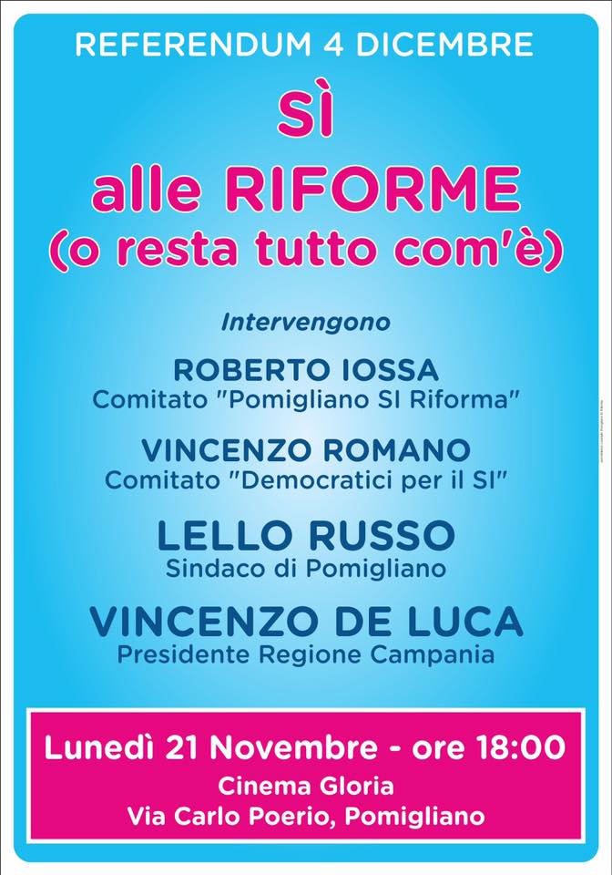 A Pomigliano d’Arco il centrodestra sceglie di andare controcorrente per non tornare indietro: il sindaco della città, Lello Russo, sostiene le ragioni del Sì al referendum al di là dei partiti e degli sterili dibattiti pro o contro il Governo. E per il «Sì» Russo sarà, insieme al governatore della Regione Campania, Vincenzo De Luca, nel convegno – evento «Sì alle Riforme (o resta tutto com’è)» fissato per le 18.00 di lunedì 21 novembre a Pomigliano d’Arco, nel Cinema Gloria. Interverranno, con il sindaco Russo e il presidente De Luca, Roberto Iossa (comitato «Pomigliano Si Riforma) e Vincenzo Romano (comitato «Democratici per il Sì». «Discuteremo le ragioni del Sì con il sindaco di Pomigliano, a capo di una giunta di centrodestra, e con il governatore della Campania che guida una giunta di centrosinistra – dice Roberto Iossa – due uomini con storie politiche diverse ma giunti alla stessa conclusione: le Riforme sono la “revisione necessaria al motore Italia”. Entreremo nel merito della riforma e di quello che il Sì cambierà: riduzione dei parlamentari, Camera politica e Senato delle Autonomie Locali, abolizione definitiva di Province e Cnel, riduzione degli stipendi dei consiglieri regionali, adeguamento della politica ai tempi in contrasto con il tempo dell’antipolitica».