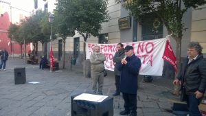 «Mio marito dovrà partire alle 3 di notte e viaggiare tutti i giorni, un’ora e mezza all’andata e un’ora e mezza al ritorno. Come potrà vivere? Come tornerà a casa?», rifletteva con gli occhi gonfi e le lacrime che continuavano a cadere. Ha due bambini, il più grande ha 7 anni. Il marito ha 39 anni, da 16 lavora in Fiat. È iscritto al sindacato Fim-Cisl ed è uno dei dipendenti che l’azienda vuole impiegare a Cassino, dove bisognerà incrementare la manodopera per far fronte alla produzione dei nuovi modelli Giulia e Stelvio di Alfa Romeo. E, secondo quanto ha raccontato il lavoratore, non può rinunciare. «Non ci possiamo esimere dall’incarico – ha affermato il metalmeccanico – l’azienda potrebbe licenziarci. Al sindacato mi sono rivolto, ma mi hanno detto che non mi conviene rifiutare, altrimenti mi devo prendere le mie responsabilità. La lotta la dobbiamo fare contro sindacato e azienda, ma ci dovrebbe tutelare il Governo. Loro si comportano così perché lo Stato non si interessa di noi. Siamo ridotti a uno straccio. C’è un clima di paura, perché nessuno ci tutela». «Avrò circa 500 euro in busta paga in più, netti sono più o meno 380 euro», ha aggiunto. È un grido d’allarme, il suo, ma silenzioso, «perché – si è giustificato – ho dei figli da mantenere, un affitto da pagare di 500 euro e non posso rischiare di perdere il posto di lavoro». Sullo sfondo, intanto, proseguiva la manifestazione in piazza. Una cinquantina i partecipanti. «Siamo in pochi e questo ci deve far riflettere» ha dichiarato al microfono Don Peppino Gambardella, il prete operaio arrivato tra una messa e l’altra a portare il suo sostegno.