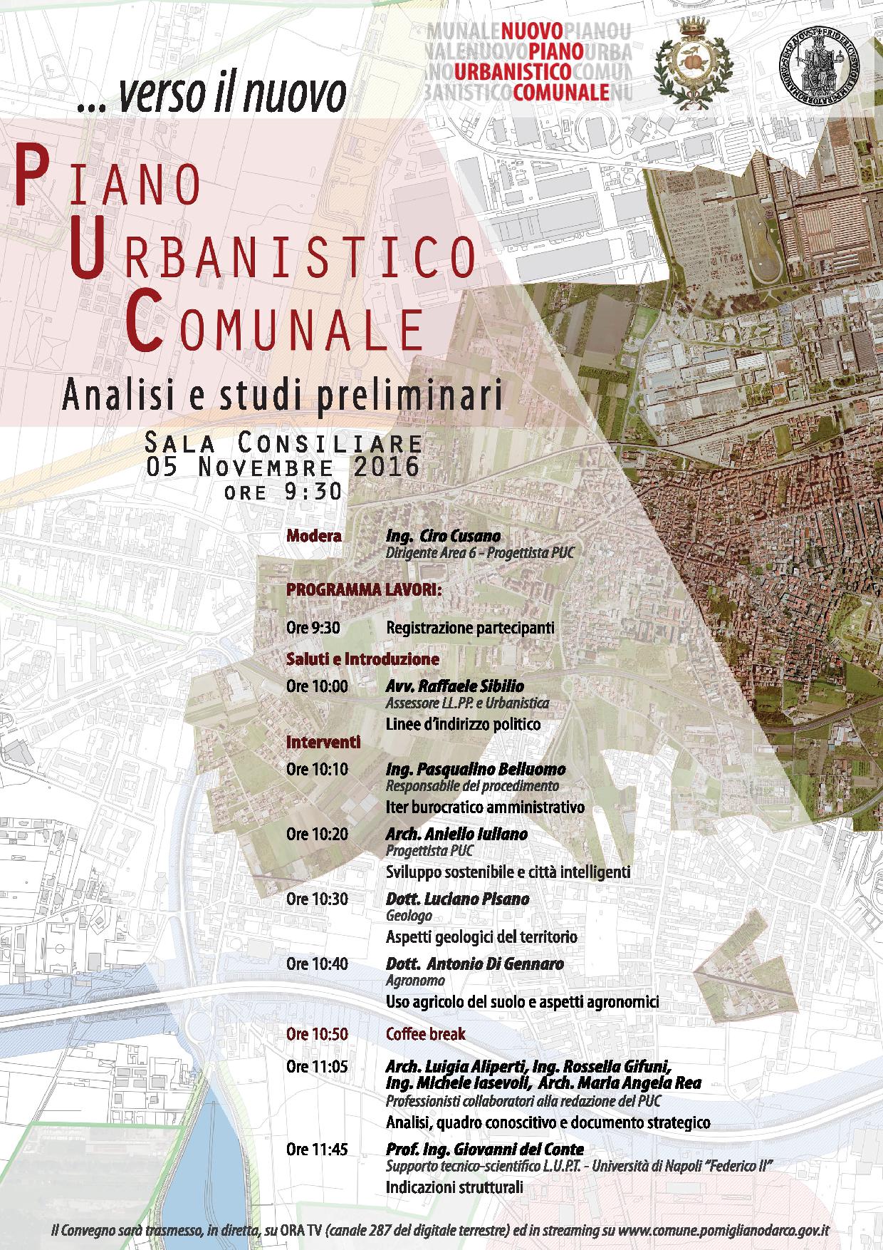 Dalle 9, 30 di sabato 5 novembre, i primi passi verso il Puc: l’amministrazione comunale guidata dal sindaco Lello Russo, proporrà le linee di indirizzo del nuovo piano urbanistico comunale. Sarà presente l’assessore ai Lavori Pubblici e Urbanistica, Raffaele Sibilio. Il convegno sarà trasmesso in diretta da ORA TV, canale 287 del digitale terrestre e in streaming sulla pagina ufficiale dell’Ente www.comune.pomiglianodarco.gov.it.