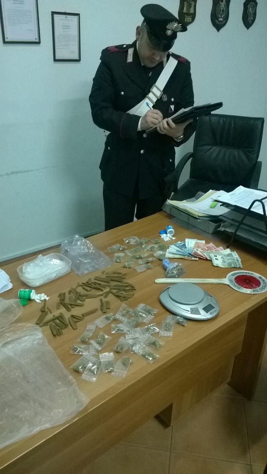 Perquisendo la sua abitazione i militari hanno trovato 62 grammi di marijuana in un barattolo nella dispensa, un bilancino, materiale per confezionare le dosi e, all’interno della cassaforte, 4.700 euro in contante ritenuti provento illecito.