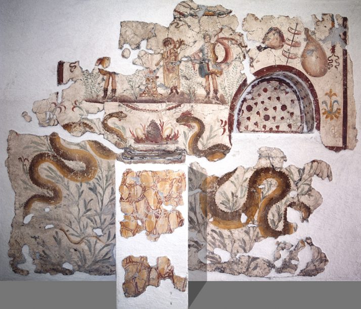 In particolare si potrà ammirare la pittura del Larario, rinvenuto nell’ambiente cucina della “Villa 6” con la rappresentazione dei due lari e del Genio sacrificante e con la raffigurazione di due serpenti che si avvicinano ad un piatto di offerte.