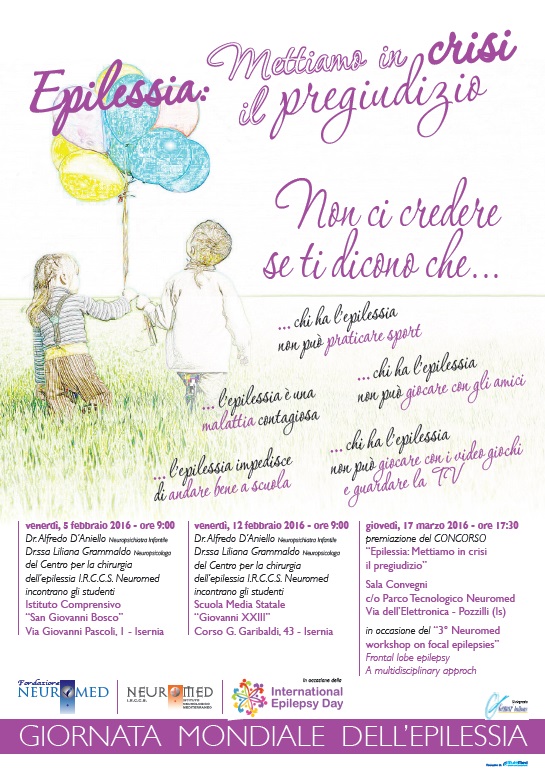 - Gli studenti delle terze classi degli Istituti coinvolti parteciperanno al concorso Neuromed dal titolo “Epilessia: mettiamo in crisi il pregiudizio”. Ogni classe presenterà un elaborato grafico che verrà giudicato dal una commissione composta da due rappresentati delle scuole, due specialisti del Centro di Epilessia Neuromed e dal Presidente della Fondazione Neuromed. La premiazione dei lavori più significativi avverrà giovedì, 17 marzo 2016, alle ore 17:30 presso la Sala Conferenze del Parco Tecnologico I.R.C.C.S. Neuromed in occasione del ‘3° Neuromed workshop on focal epilepsies”.