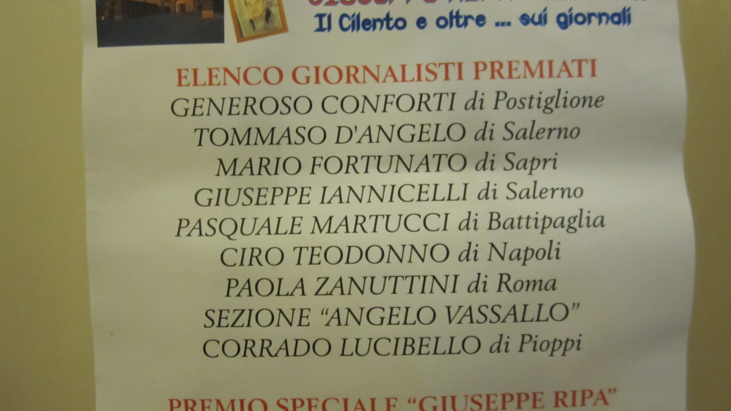 Gli altri giornalisti premiati sono i seguenti: Generoso Conforti di Postiglione; Tommaso D’Angelo di Salerno; Mario Fortunato di Sapri; Giusepe Iannicelli di Salerno; Pasquale Martucci di Battipaglia; Paola Zanuttini di Roma.