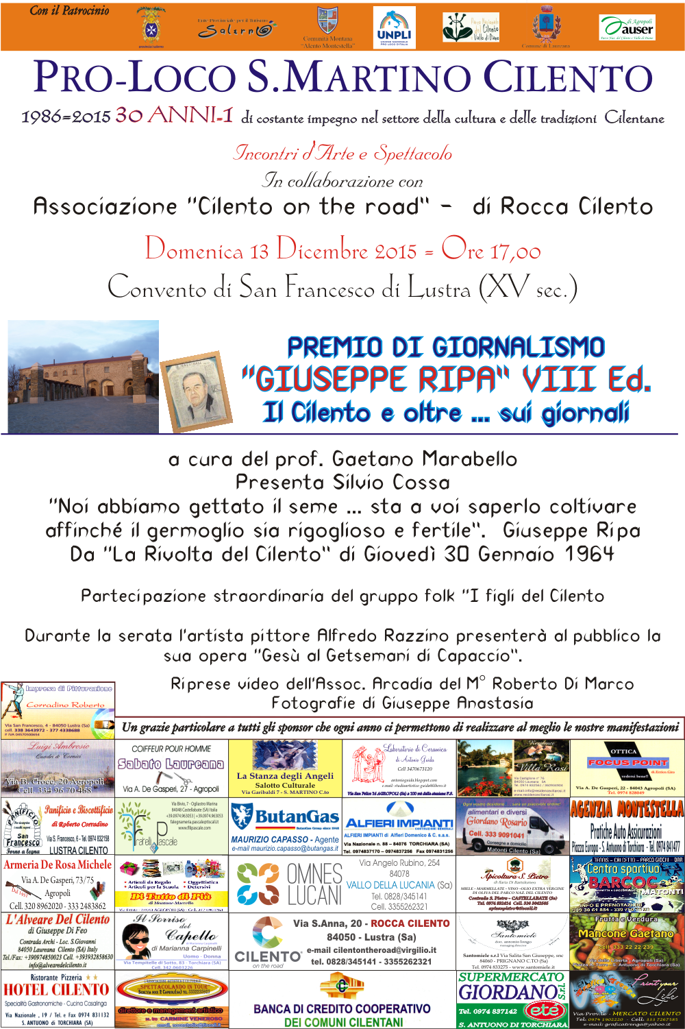 Presso il convento di San Francesco di Lustra si è tenuta ieri la VIII^ edizione del Premio di giornalismo “Giuseppe Ripa” il Cilento e oltre … organizzato dalla Pro loco San Martino Cilento.