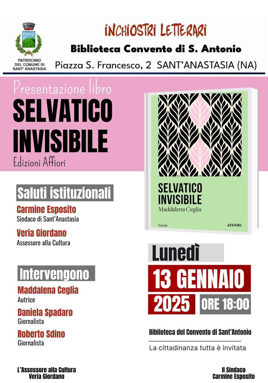 Alle 18:00 di lunedì 13 gennaio – nella biblioteca “Guido Giustiniani” del Convento di Sant’Antonio, nell’ambito della rassegna “InChiostri Letterari”, sarà presentato il libro “Selvatico Invisibile” la prima raccolta di poesie di Maddalena Ceglia edita da Affiori.