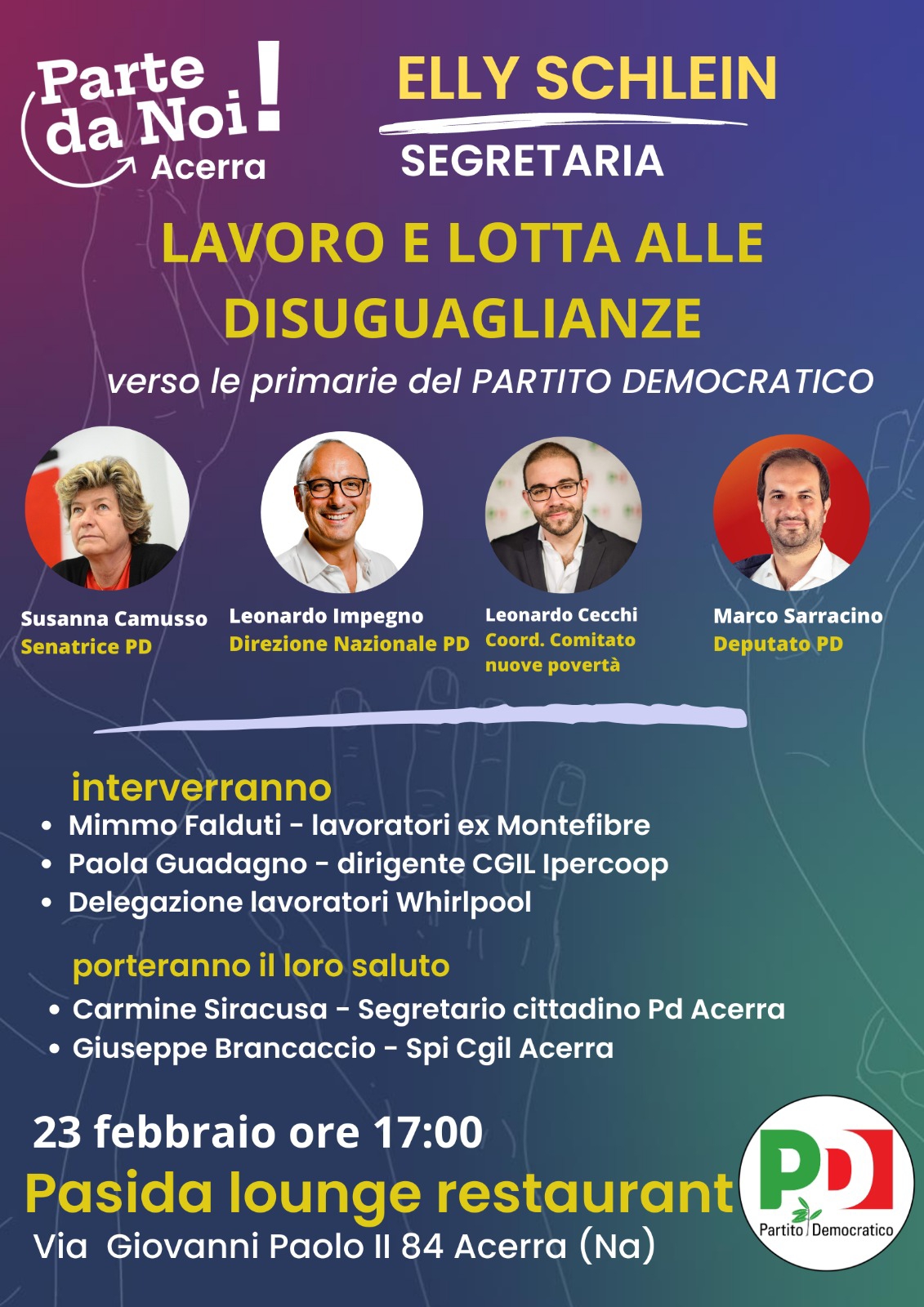 Proprio in vista delle primarie aperte di domenica, il Comitato cittadino ha organizzato per giovedì 23 febbraio ore 17.00 presso il Pasida Lounge & Restaurant di Acerra sito alla via Giovanni Paolo II n. 84, un momento di confronto su temi portanti del nuovo Pd, ovvero “Lavoro e lotta alle disuguaglianze” con la partecipazione della Senatrice PD Susanna Camusso, già Segretario Generale della CGIL, del avv. Leonardo Impegno, membro della direzione nazionale, già deputato del Pd, del dott. Leonardo Cecchi, Coordinatore del Comitato Parte da Noi – Nuove povertà e disuguaglianze ed ideatore del “reddito alimentare”, approvato con emendamento del Pd nella ultima legge di Bilancio, del Deputato Marco Sarracino, segretario provinciale del Pd Napoli.