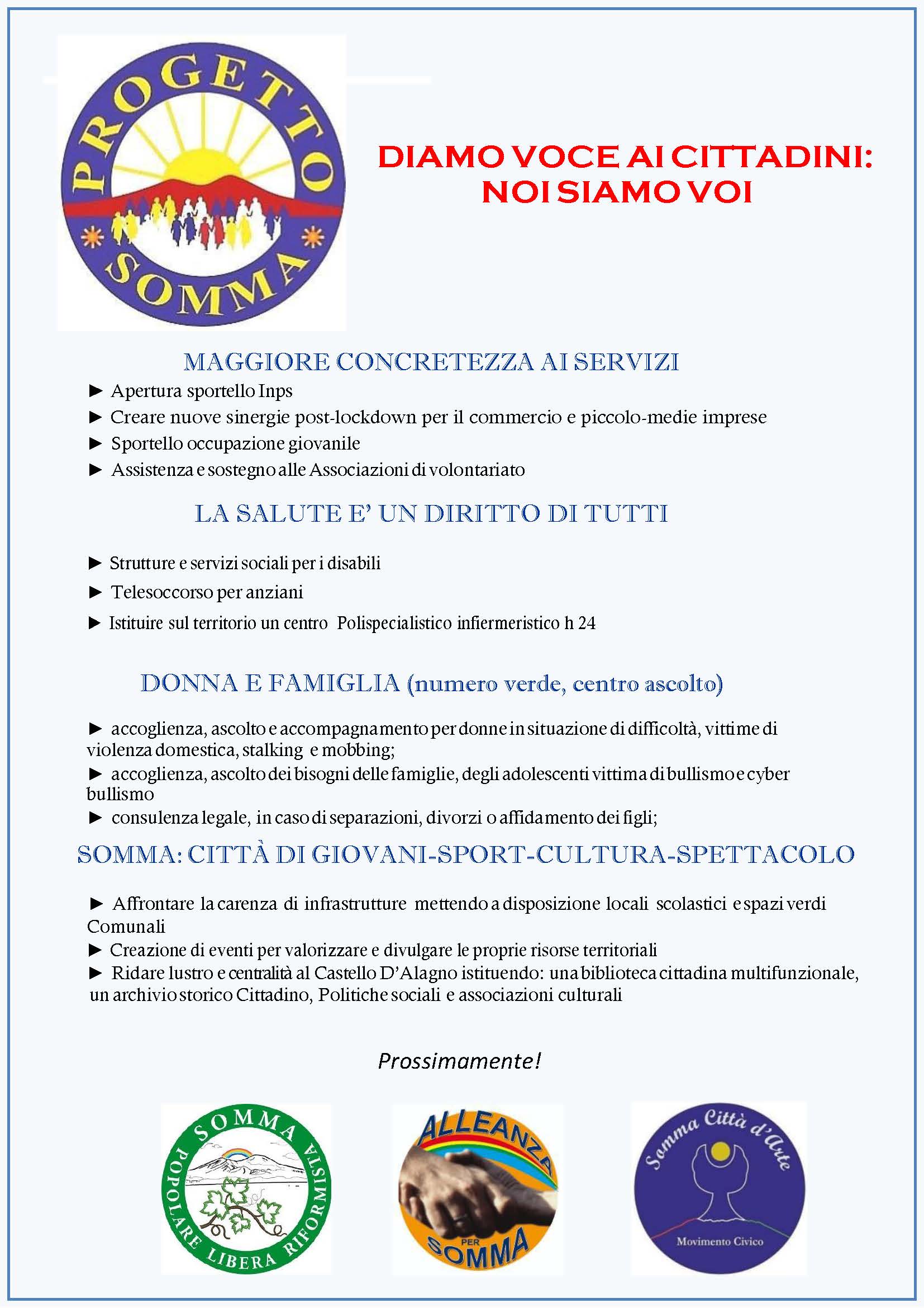 “ Può darsi che non siate responsabili della situazione in cui vi trovate, ma lo diventerete se non fate nulla per cambiarla” Essendo prossime le elezioni cittadine il movimento “Progetto Somma” che da tempo vuole migliorare la vivibilità della nostra città, insieme a “Somma Popolare Riformista Libera”, “Alleanza per Somma”, “Somma Città d’Arte”, presenta i punti più rilevanti del programma, ponendo al centro le esigenze dei cittadini.