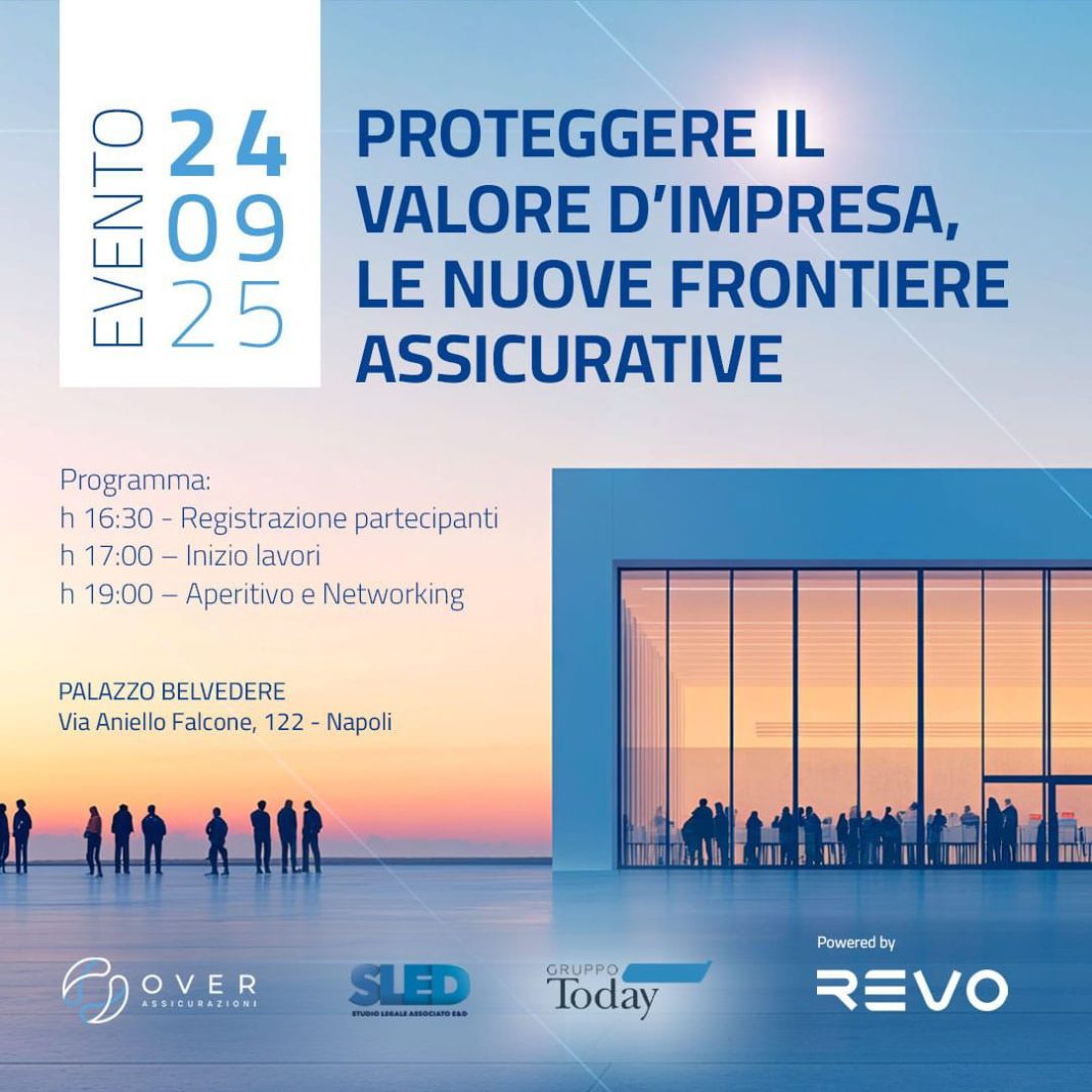 L’incontro nasce dalla collaborazione tra OVER Assicurazioni, SLED Studio Legale Associato e Gruppo Today, con il contributo di REVO Insurance, compagnia assicurativa specializzata in polizze parametriche e rischi speciali, dedicata alle PMI. Una sinergia di competenze che intende offrire alle imprese strumenti concreti per trasformare la consulenza legale e assicurativa da semplice scudo difensivo a vera leva di sviluppo.