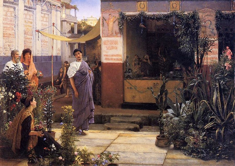 Ovviamente, il quadro di Alma Tadema non dice ciò che ho scritto in apertura: rappresenta un mercato delle erbe davanti a una “cantina” probabilmente pompeiana.