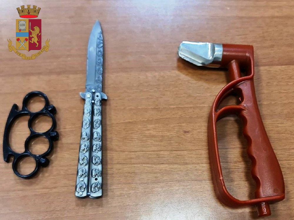 I poliziotti lo hanno raggiunto ed identificato per un 14enne di San Giorgio a Cremano trovandolo in possesso di un tirapugni, un coltello a farfalla con la lama della lunghezza di 11 cm e un martello frangivetro;Â pertanto, lo hanno denunciato per porto di armi od oggetti atti ad offendere e lo hanno affidato ai genitori.