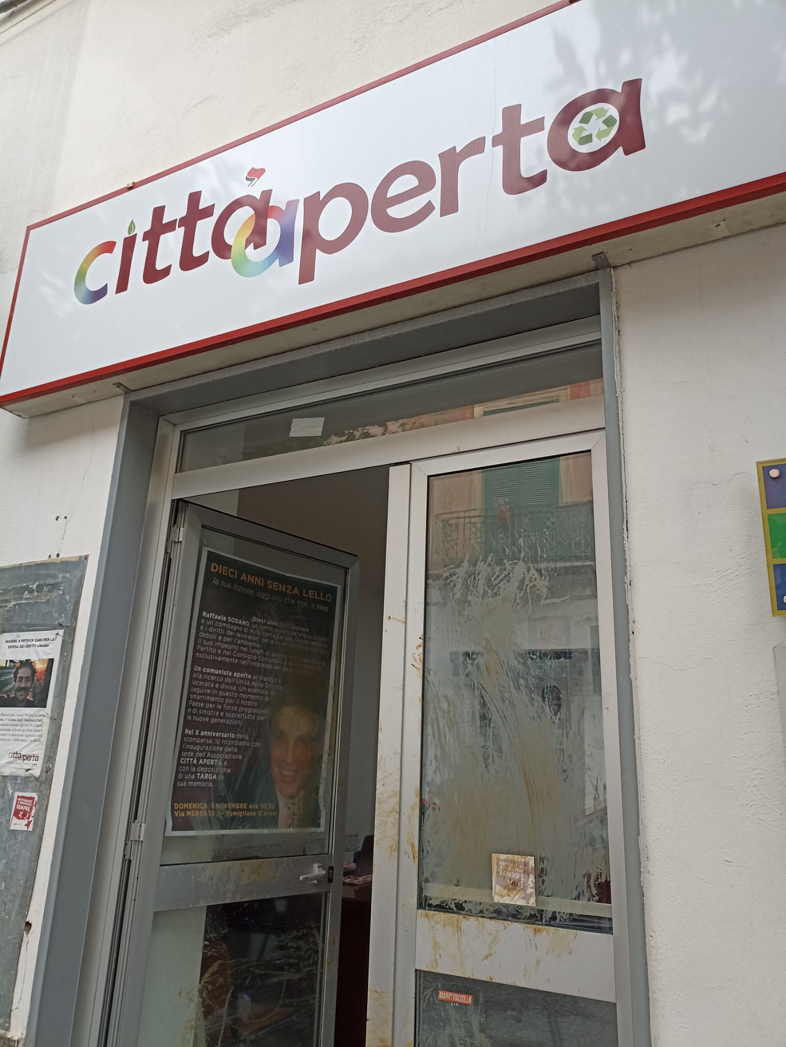 Escrementi cosparsi sulla porta dell’associazione di sinistra “Città Aperta”, la cui sede di Pomigliano ospita anche il distaccamento di zona dell’Anpi, l’Associazione nazionale partigiani. Lo sfregio è stato messo a segno dopo la mezzanotte di giovedi scorso da un tizio che si è recato sul posto vestendo una tuta da lavoro integrale bianca, col cappuccio che gli copriva interamente il capo in modo tale da non farlo riconoscere. L’”untore” portava con se un secchio pieno di escrementi. Si è avvicinato alla sede di Città Aperta dopo essersi guardato un po’ attorno e quindi, come se nulla fosse, ha preso lo stomachevole contenuto del secchio spargendolo sui vetri e sull’uscio dell’ingresso del locale preso di mira. Le immagini che immortalano la scena, assurda quanto inquietante, sono state catturate da una telecamera privata di videosorveglianza piazzata proprio di fronte a Città Aperta, associazione che è presieduta da Tommaso Sodano, politico di lungo corso, ex senatore di Rifondazione, ex vicesindaco di Napoli nella giunta De Magistris e ora presidente del consiglio di amministrazione della Sma Campania, società della Regione che si occupa di ambiente e rifiuti. E’ stato proprio Sodano a denunciare l’accaduto ai carabinieri e alla polizia municipale.