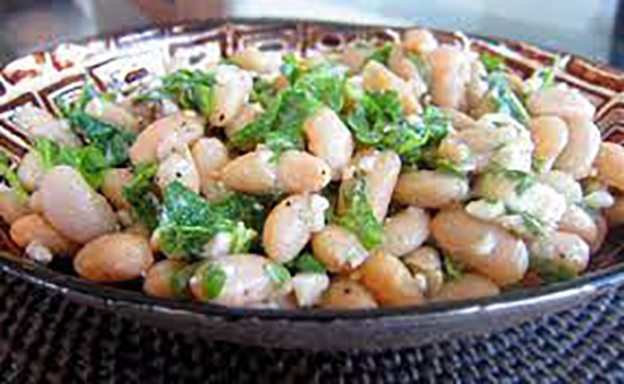 Mettere in una casseruola un trito di aglio, di prezzemolo e di sedano, l’olio, una parte dei fagioli scolati, e gli altri fagioli con il liquido in cui sono conservati. Dopo aver cosparso il tutto con il sale, con il pepe e con l’origano, coprire la casseruola e far cuocere a fuoco moderato per un quarto d’ora. Completata la cottura, coprire il fondo dei piatti con fette di pane raffermo, versarvi sopra i fagioli e portare in tavola (l’immagine è pubblicata su internet).