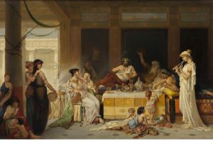 La tavola dei ricchi non permetteva l’uso dei coltelli, di cui i commensali, stesi sul triclinio, non potevano servirsi: se ne servivano quelli della cucina e coloro che mangiavano, stando seduti, nelle osterie e nelle cantine, le “tabernae” e le “popine”. Raccontano gli storici che fu Richelieu a disporre, con un decreto, che i coltelli da tavola avessero la punta arrotondata: lo indussero ad adottare il provvedimento le ragioni della sicurezza e il tentativo di porre fine alla disgustosa abitudine del cancelliere Sèguier di pulirsi i denti con la punta del coltello: a tavola, davanti a tutti. I Romani usavano come stuzzicadenti – “dentiscalpium” – una scheggia di lentischio, o, ci dice Marziale, una penna. Trimalchione, invece, usava una “spina d’argento”. Nelle sale da pranzo non mancava mai il “muscarium”, lo “scacciamosche”: Marziale consigliava che fosse “pavoninum”, fatto con la coda di un pavone. I ricchi potevano mettere in tavola grandi piatti cesellati in oro, ma quella malalingua di Marziale svelava che qualche ricco avaro offendeva questi preziosi piatti usandoli per una triglia piccola: una triglia degna di stare in queste opere d’arte doveva pesare almeno 700 grammi. Grande era la varietà di coppe, bicchieri, boccali e tovaglie: ma la “nocellara” incomincia a produrre le sue suggestioni e mi invita al silenzio.