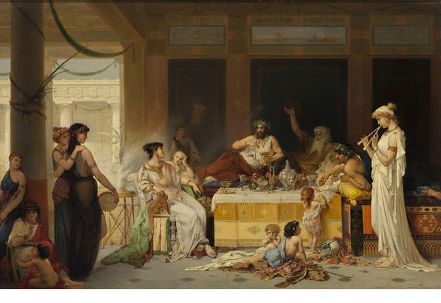 Perché questi spaghetti alla “nocellara” del Vesuvio non sono una variante degli spaghetti alla “puttanesca”. Le posate degli antichi Romani: i cucchiai, i coltelli, gli stuzzicadenti. E nelle sale da pranzo dei ricchi c’era lo scacciamosche fatto con la coda di un pavone. Quando si diffuse l’uso della forchetta. Fu Richelieu a disporre che i coltelli da tavola avessero la punta arrotondata. In appendice è pubblicato il “Banchetto nell’antica Roma” dipinto dal pittore belga Joseph Coomans (1816- 1889).