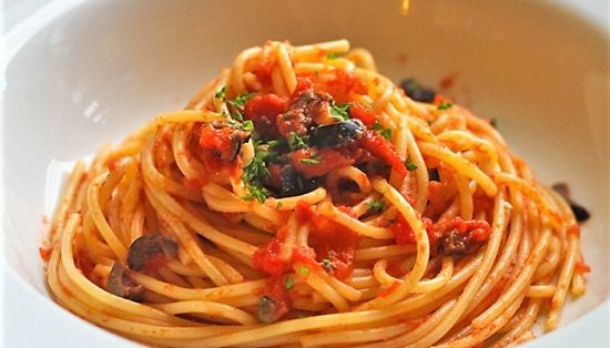 Ingredienti: gr. 350 spaghetti; gr. 600 polpa di pomodoro; gr. 100 olive “nocellara” denocciolate; ½ cipolla; olio di “nocellara”, origano, pepe, sale, provolone del Monaco grattugiato. Tritate la mezza cipolla, fatela rosolare in una padella ampia, in un filo d’olio di “nocellara” del Vesuvio. Aggiungete le olive “nocellara” tagliate a rondelle, fate rosolare; poi versate la polpa di pomodoro, una punta di origano, un poco d’acqua, pepate e salate con moderazione, perché il sapore delle olive non sia contaminato dall’eccesso di sale, coprite la padella e lasciate cuocere il sugo, rimestando di tanto in tanto. Al momento opportuno, versate nella padella gli spaghetti cotti a parte e presi rigorosamente “al dente”, e fateli “saltare”, aggiungendo un poco d’acqua di cottura; infine portate in tavola il piatto, moderatamente cosparso di provolone del Monaco grattugiato.