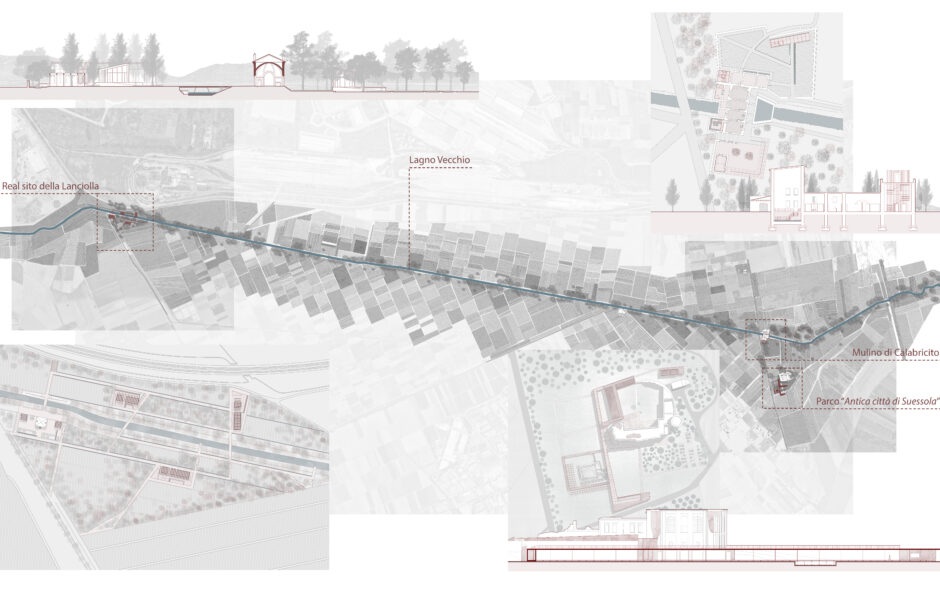 Un museo dell’acqua che riconnette i livelli interni del mulino e ne ridisegna i cortili esterni, un parco della memoria borbonica in cui ritrovare l’eco delle grandi opere di bonifica e un’infrastruttura per la ricerca archeologica pubblica sono le nuove attività che connotano i tre siti nella visione sviluppata dalle tre tesi. Questi luoghi, testimoni di una profonda interconnessione tra patrimonio, acqua e paesaggio rurale, vengono interpretati come presidi narrativi e inneschi di strategie di tutela, risanamento e fruizione innovativa per un ampio brano di paesaggio acerrano.