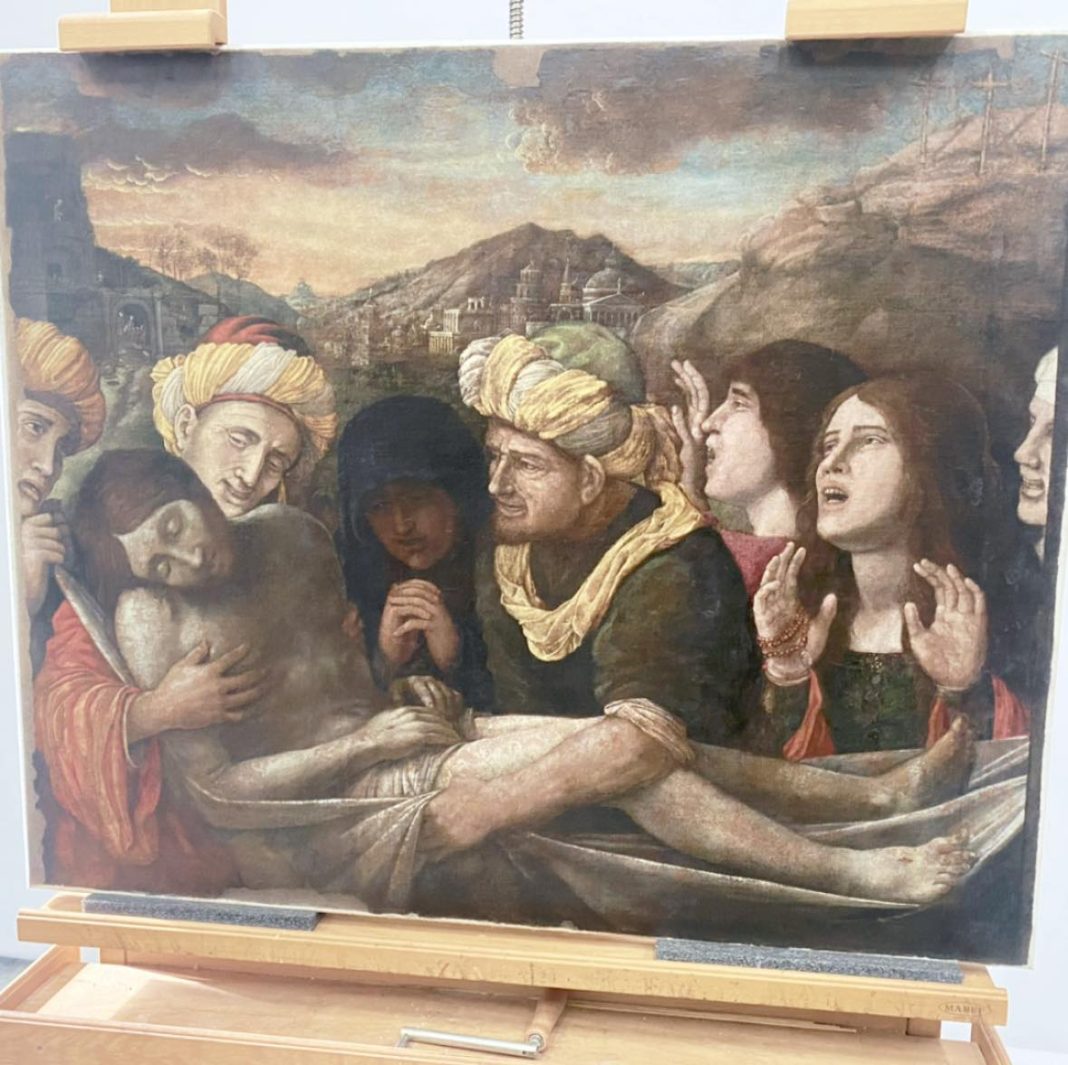 Sul sito era stata pubblicata un’immagine di una Deposizione molto deteriorata conservata a Pompei, che l’esperto ha avuto modo di visionare nell’estate del 2021. “L’opera appariva compromessa da numerosi interventi successivi, ma alcune parti meglio conservate – il volto addolorato della Maddalena, lo sfondo con la Gerusalemme celeste, la porta monumentale a sinistra che richiama l’Arco di Tito – erano di una qualità tale da escludere che si trattasse di una semplice replica d’epoca”.