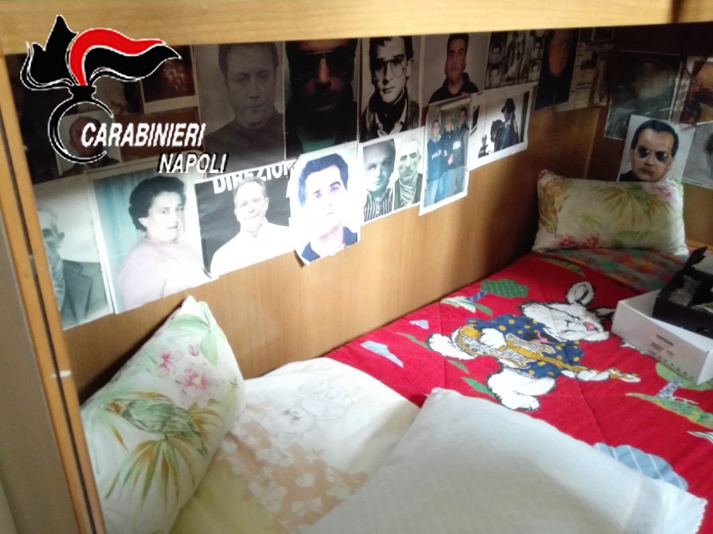 Alle pareti di vari ambienti della casa numerose effigi e articoli di giornale riguardanti vari capi clan, sia di camorra che di mafia.