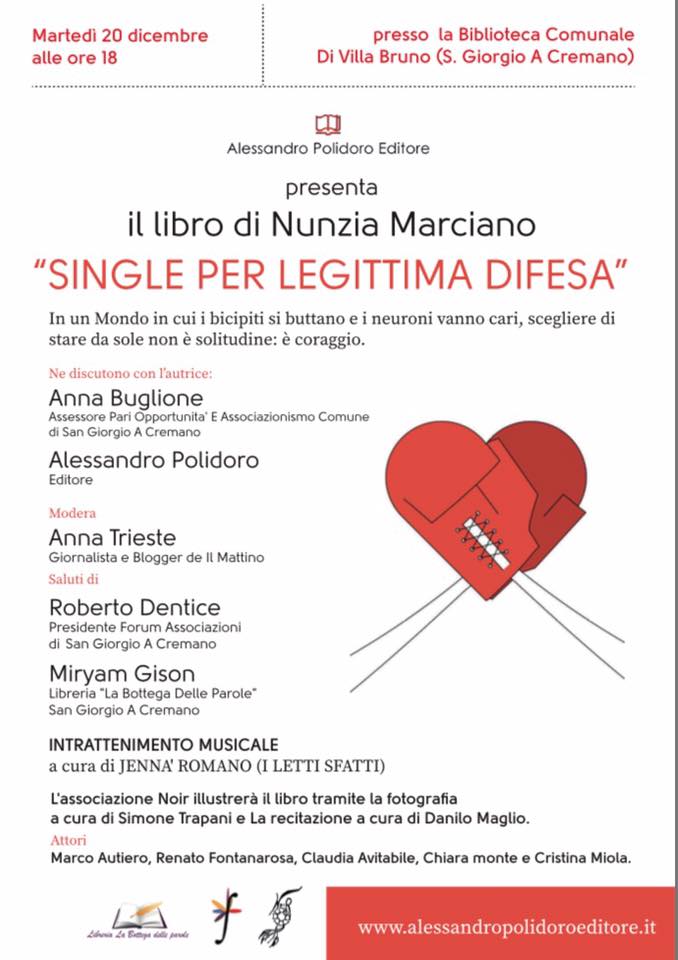 Si terrà domani, martedì 20 dicembre, a partire dalle ore 18.00 presso la Biblioteca comunale di San Giorgio a Cremano in Villa Bruno, Via Cavalli di Bronzo, n. 22 la presentazione del libro “Single per legittima difesa”, della giornalista Nunzia Marciano per la Alessandro Polidoro Editore.