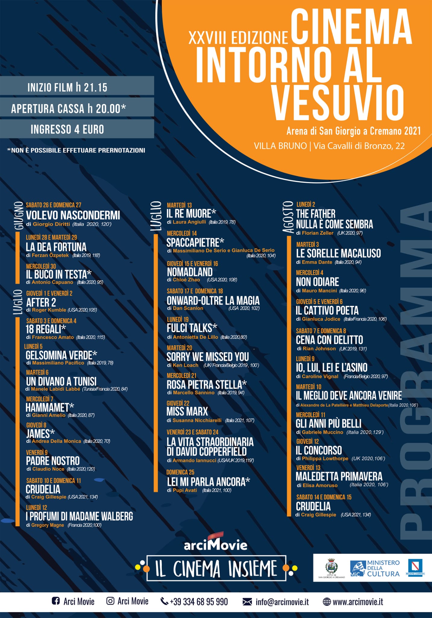 “Arci Movie riparte con il grande cinema per la nostra arena di San Giorgio a Cremano – dice Roberto D’Avascio, presidente di Arci Movie – Tutta la nostra associazione ha fatto in queste settimane uno sforzo enorme per ripartire a Villa Bruno con una rassegna lunga, di grande qualità, con tanti incontri ed ospiti per andare incontro al nostro pubblico, in astinenza da cinema da troppo tempo. Il cinema si fa insieme ai nostri soci, ai tanti spettatori che ci seguono da anni, agli appassionati di cinema. Si riparte bene solo se saremo tutti insieme. La nostra arena sarà di nuovo piena di tante presenze in sala davanti al grande schermo e questo restituirà un senso al nostro lavoro”