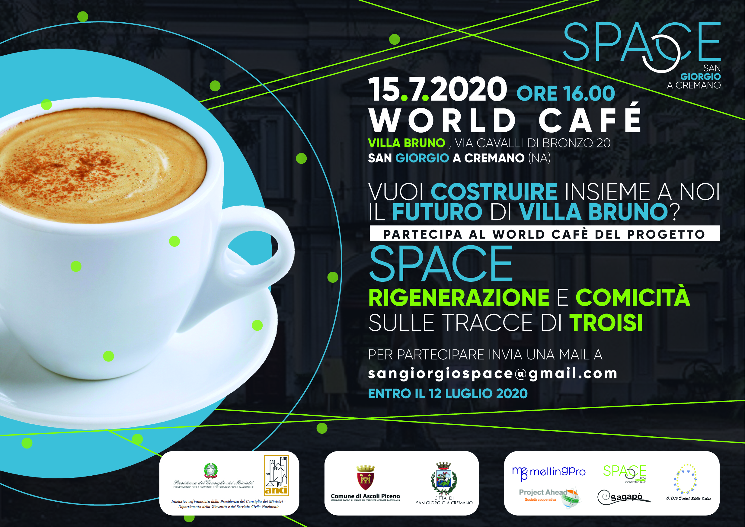 Al via il progetto Space. Rigenerazione e comicità sulle tracce di Troisi promosso dal Comune di Ascoli Piceno con il Comune di San Giorgio a Cremano, le organizzazioni Melting Pro, Associazione Space, Project Ahead, Sagapò Onlus, Dodici Stelle Onlus. L’iniziativa è cofinanziata dalla Presidenza del Consiglio dei Ministri – Dipartimento della Gioventù e del Servizio Civile Nazionale e dell’Associazione Nazionale Comuni Italiani (ANCI). Il progetto prevede il trasferimento e adattamento al contesto territoriale del comune di S. Giorgio a Cremano di SPACE, buona pratica di innovazione socio-culturale giovanile ideata da Melting Pro e sperimentata in vari contesti territoriali nazionali e internazionali.