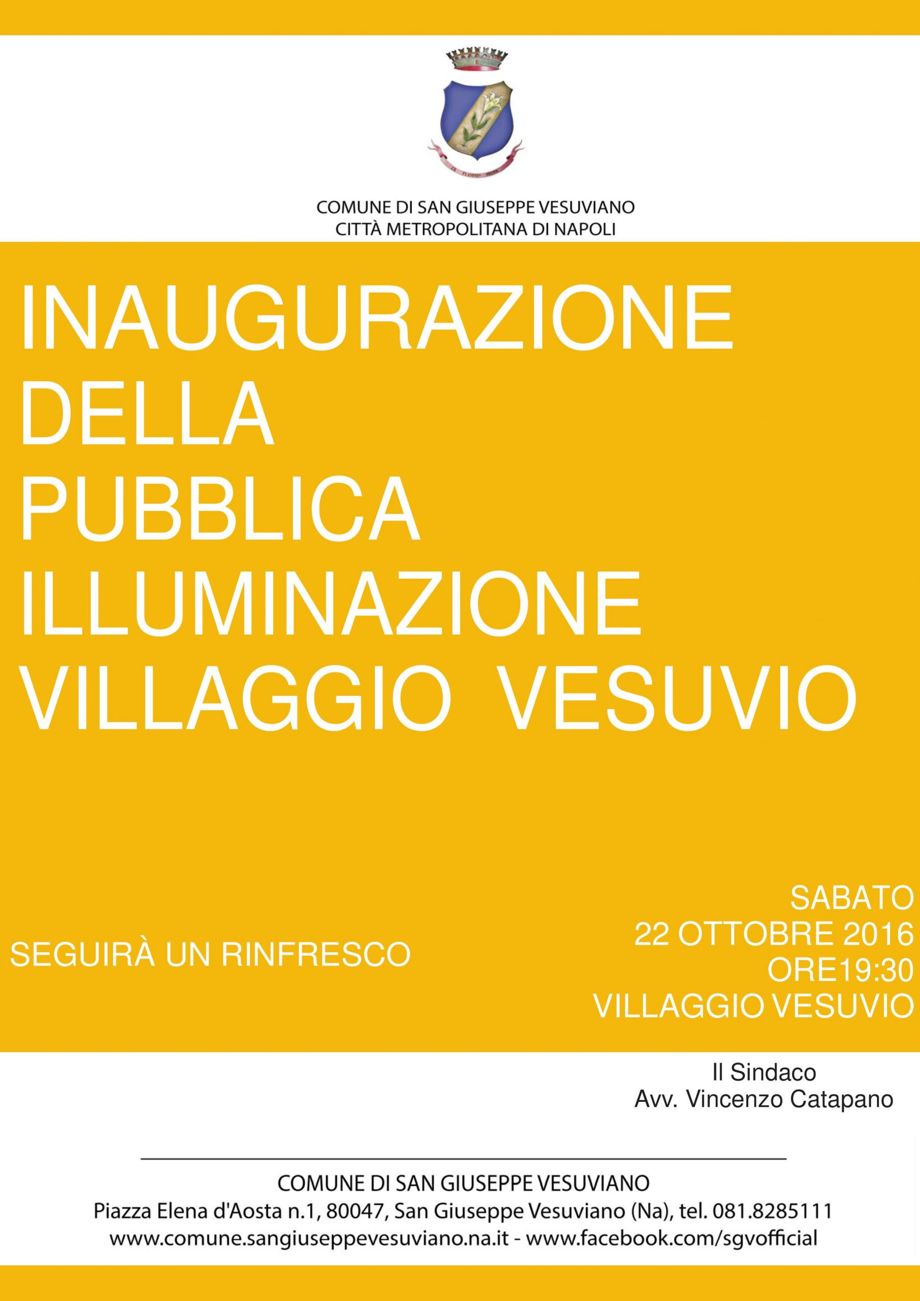 Si tratta di un risultato storico e lungamente atteso dai cittadini della zona. A fronte delle molteplici istanze formulate negli anni, il Villaggio Vesuvio, popoloso quartiere residenziale a monte di San Giuseppe Vesuviano, ha finalmente ottenuto la pubblica illuminazione delle sue strade e dei suoi incroci. Sabato 22 ottobre, alle ore 19:30, nella piazza centrale del Villaggio Vesuvio si svolgerà la cerimonia di inaugurazione. Al taglio del nastro seguirà un momento di festa con un rinfresco per tutti.