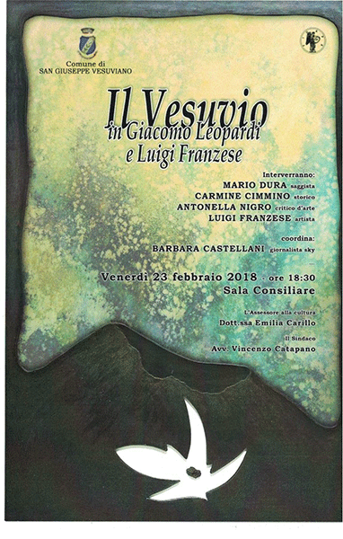 Il convegno, patrocinato dal Comune, si terrà venerdì 23 febbraio, nella Sala Consiliare del Municipio di San Giuseppe Ves.no. Il prof. Mario Dura esaminerà le complesse radici filosofiche e letterarie della “visione” del Vesuvio elaborata da Giacomo Leopardi; Carmine Cimmino parlerà della “percezione” del vulcano nella “ Ginestra” del poeta recanatese e nella pittura di Luigi Franzese, che da anni condensa in quadri di complessa struttura le sue riflessioni sulla natura “mitica” del vulcano; Antonella Noto, che occupa un posto di rilievo nel panorama della critica d’arte, e lo stesso Luigi Franzese esamineranno da più punti di vista il coerente percorso di una esperienza artistica che interpreta la realtà attraverso le forme, ora drammatiche, ora serene, dell’esperienza, e non indulge ai giochi di quella che Gombrich chiamava “la retorica pittorica del vuoto”.