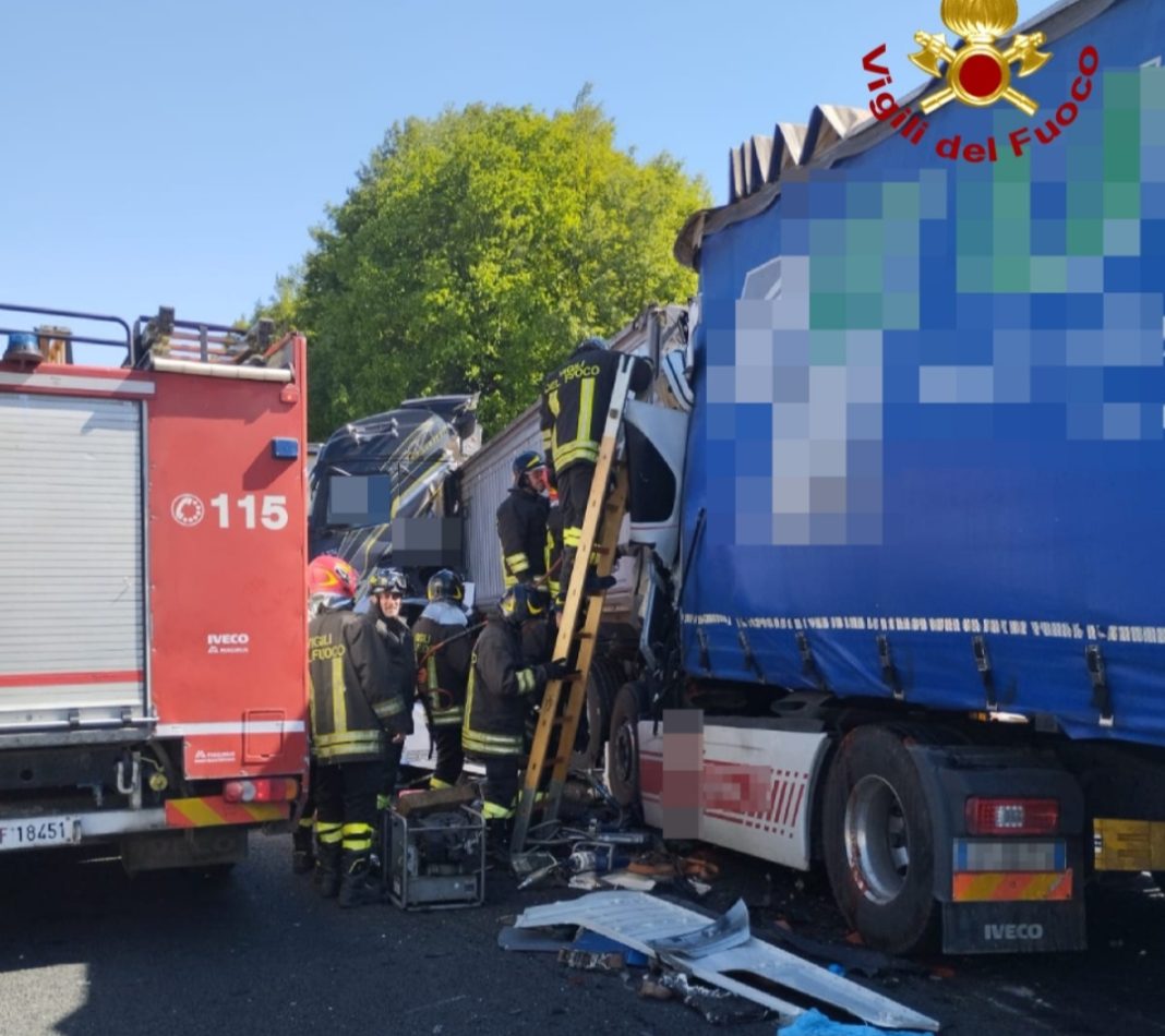Giunti immediatamente sul posto i Vigili del Fuoco hanno dovuto soccorrere varie persone che, in seguito all’urto tra i veicoli, sono rimaste ferite tra cui una persona, l’autista di uno dei TIR, che è rimasta incastrata tra le lamiere.