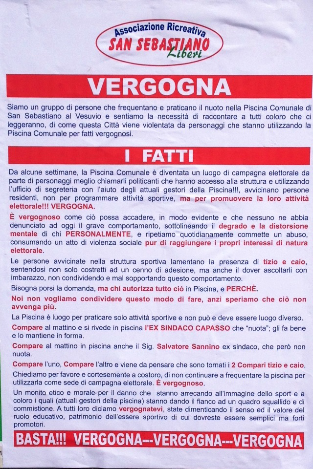 Ma la cosa più bella ed esilarante è stata quella del manifesto apparso ieri mattina per le vie del paese, un manifesto a nome di una fino ad ora sconosciuta “Associazione ricreativa San Sebastiano liberi”. Tale associazione attacca duramente e senza mezzi termini Pino Capasso e Salvatore Sannino, accusandoli di aver fatto proselitismo nella struttura sportiva della piscina comunale. Fin qui niente di strano, lo stesso Sannino aveva preferito il porta a porta invece del pubblico confronto, prima di passare alle urne e come abbiamo detto, l’ex sindaco pare sia sceso in campo con visite e telefonate ma la cosa che più ci lascia perplessi è perché proprio adesso? Perché questo manifesto non è uscito più opportunamente prima delle primarie? Qualcuno ancora sostiene che vi siano stati addirittura impedimenti alla sua pubblicazione ma anche quest’eventualità, come tutta questa storia ci pare una forzatura che non sta né in cielo e né in terra.