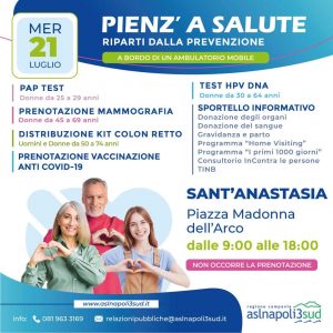 Nella stessa giornata, presso il truck della prevenzione Asl, sarà data la possibilità a tutte le persone straniere e a quelle non in possesso di tessera sanitaria, presenti sul territorio anastasiano, aderire alla campagna vaccinale anti Covid-19.