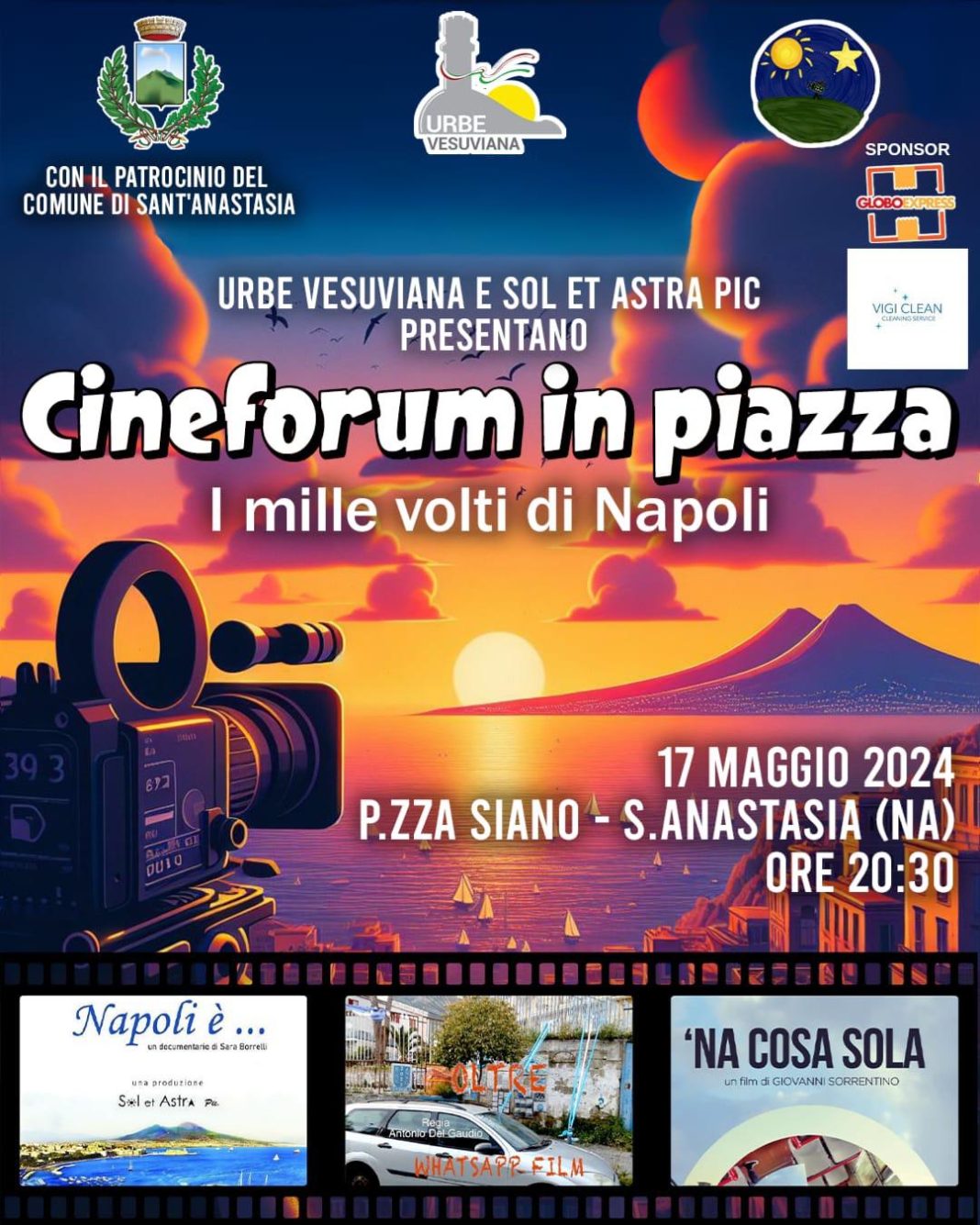 Una serata di cinema e dibattito sotto le stelle, nel corso della quale alla magia della proiezione su schermo si accompagnerà il piacere del tempo condiviso all’aria aperta e del confronto. È questo quanto in programma venerdì 17 maggio, a partire dalle ore 20:30, in Piazza Siano a Sant’Anastasia, per il nuovo evento organizzato dall’associazione culturale Urbe Vesuviana in collaborazione con la casa di produzione cinematografica Sol et Astra Pic. “Cineforum in piazza – I mille volti di Napoli”, questo il titolo dell’iniziativa, gode del patrocinio del comune di Sant’Anastasia. Nel corso della serata saranno proiettati tre cortometraggi con un unico comune denominatore, la città di Napoli. Si tratta di “Napoli è…”, a cura di Sara Borrelli, “‘Na cosa sola”, a cura di Giovanni Sorrentino, e “Oltre”, a cura di Antonio Del Gaudio. «Dopo i saluti istituzionali degli organizzatori e dell’Amministrazione comunale ci saranno le proiezioni, intervallate da un dibattito tra i registi e il pubblico presente, in modo da stimolare una riflessione sulle problematiche e le potenzialità del nostro territorio e offrire una serata di intrattenimento alla cittadinanza» ha spiegato Vincenzo Di Costanzo, presidente di Urbe Vesuviana, associazione che ancora una volta propone all’ombra del Vesuvio un momento di crescita culturale e incontro sociale, che fa cultura e intrattenimento senza dimenticare la valorizzazione del territorio, da sempre obiettivi fondamentali dell’associazione.