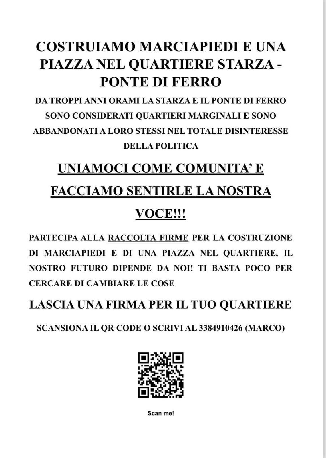Sant’Anastasia. In un’iniziativa che unisce tutta la comunità, Marco Auriemma, un cittadino di Sant’Anastasia, ha avviato una raccolta firme per chiedere la realizzazione di marciapiedi e di una piazza in zona Starza – Ponte di Ferro, luogo in cui vive. L’assenza di queste infrastrutture, secondo Auriemma, incide negativamente sulla qualità della vita degli abitanti.