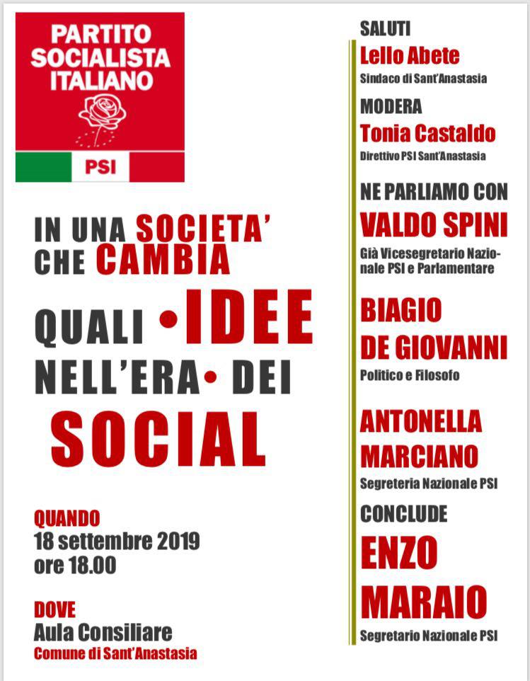 Nell’aula consiliare di Palazzo siano, mercoledì 18 settembre alle ore 18, la sezione locale del Psi promuove una discussione sui bisogni e le ragioni della società in evoluzione.