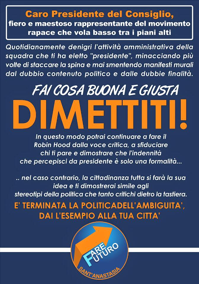 «Caro presidente del consiglio, fiero e maestoso rapace del movimento che vola basso tra i piani alti…». Così principia la lettera – manifesto di «Fare Futuro», associazione politico – culturale della quale è segretario Luigi Corcione. Il presidente del consiglio comunale è ovviamente Mario Gifuni, il movimento è Sant’Anastasia in Volo ma il manifesto si limita ad un singolo attacco, quello alla carica istituzionale, lasciando fuori gli esponenti consiglieri, Mario Trimarco e Rosaria Fornaro.