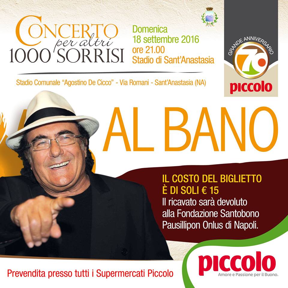 Alle 21 di domenica 18 settembre, invece, in una ideale prosecuzione dei festeggiamenti, Michele Piccolo offrirà, con il patrocinio morale del Comune, un concerto di Albano Carrisi: la location è lo stadio comunale «Agostino De Cicco» di via Romani ed è ancora possibile acquistare i biglietti, per un costo di 15 euro, nelle sedi dei supermercati Piccolo. L’intero ricavato dell’evento sarà devoluto alla fondazione Santobono Pausillipon Onlus. Una presenza, quella dell’artista di Cellino San Marco, che si ritrova anche nell’ulivo secolare piantato a febbraio in un podere non lontano dalla sede di via Starza dell’azienda, in segno di amicizia per il vesuviano e per Michele Piccolo. «Un simbolo di pace, un simbolismo importante, un albero che sa di amicizia e di buoni frutti per il futuro» – ha detto Albano.