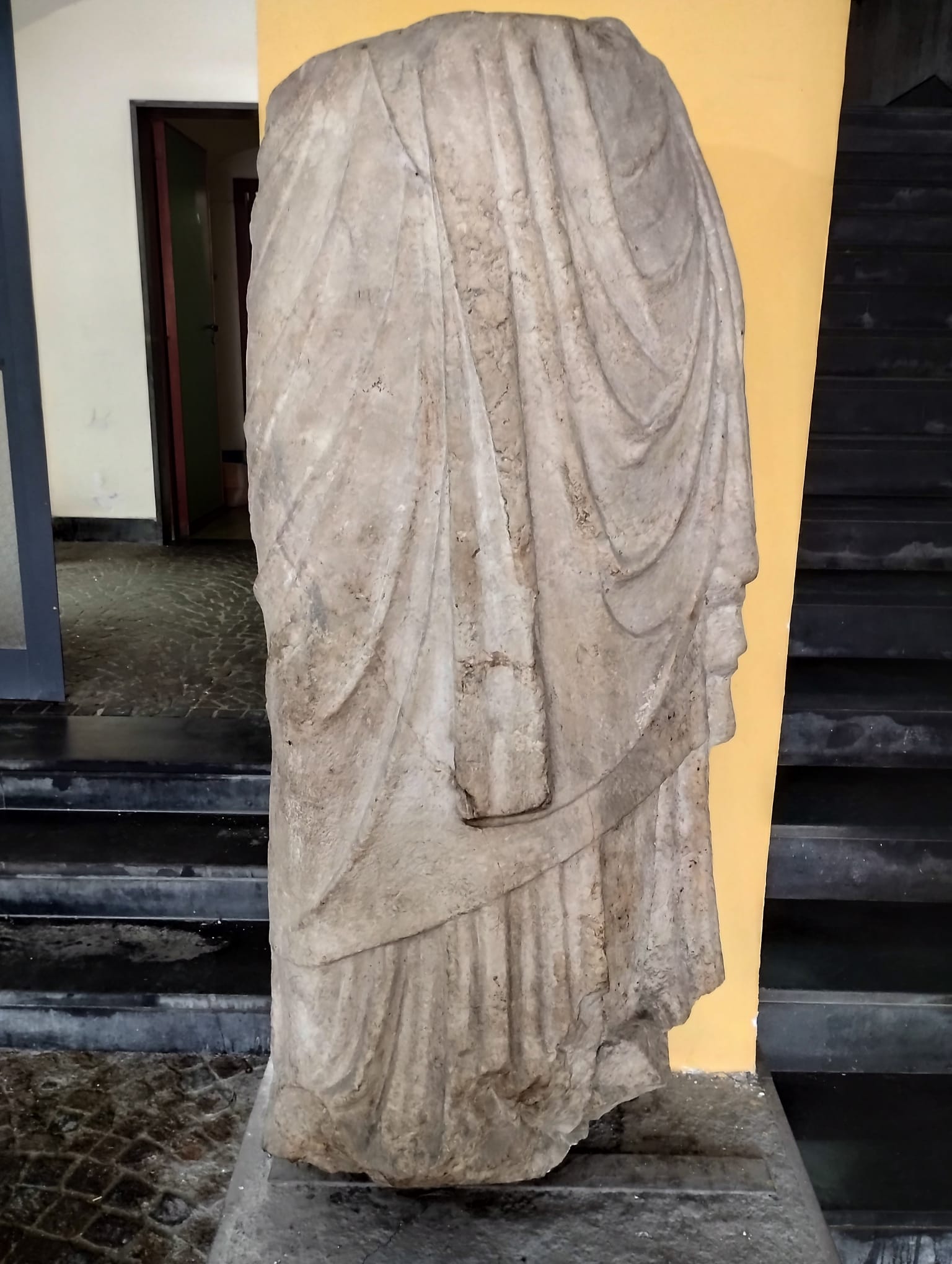 “Nell’attuale piazza Trivio, dietro la parrocchiale chiesa di Santa Maria la Nova, durante alcuni lavori di ristrutturazione del fabbricato Toscano (cit. Lello Sodano), fu rinvenuta sorprendentemente una statua femminile in marmo bianco del tipo Pudicitia, che ben incarnava i valori di castità e pudicizia, consoni alla matrona romana. Era la metà degli anni ’70 del Novecento. Durante il suo reimpiego, la statua fu privata dei piedi, della testa e tagliata lungo tutto il dorso. Oggi, si presenta ai nostri occhi alta circa 1 metro e 35 cm., larga 55 cm., spessa 30. E’ un tipo di scultura dal panneggio non eccessivamente elaborato, molto comune ed era utilizzata per decorare la facciata esterna di un monumento funerario: comunemente era il lato del sepolcro che dava sulla strada, decorato da una finestra ad arco in cui era collocata la statua della defunta.”